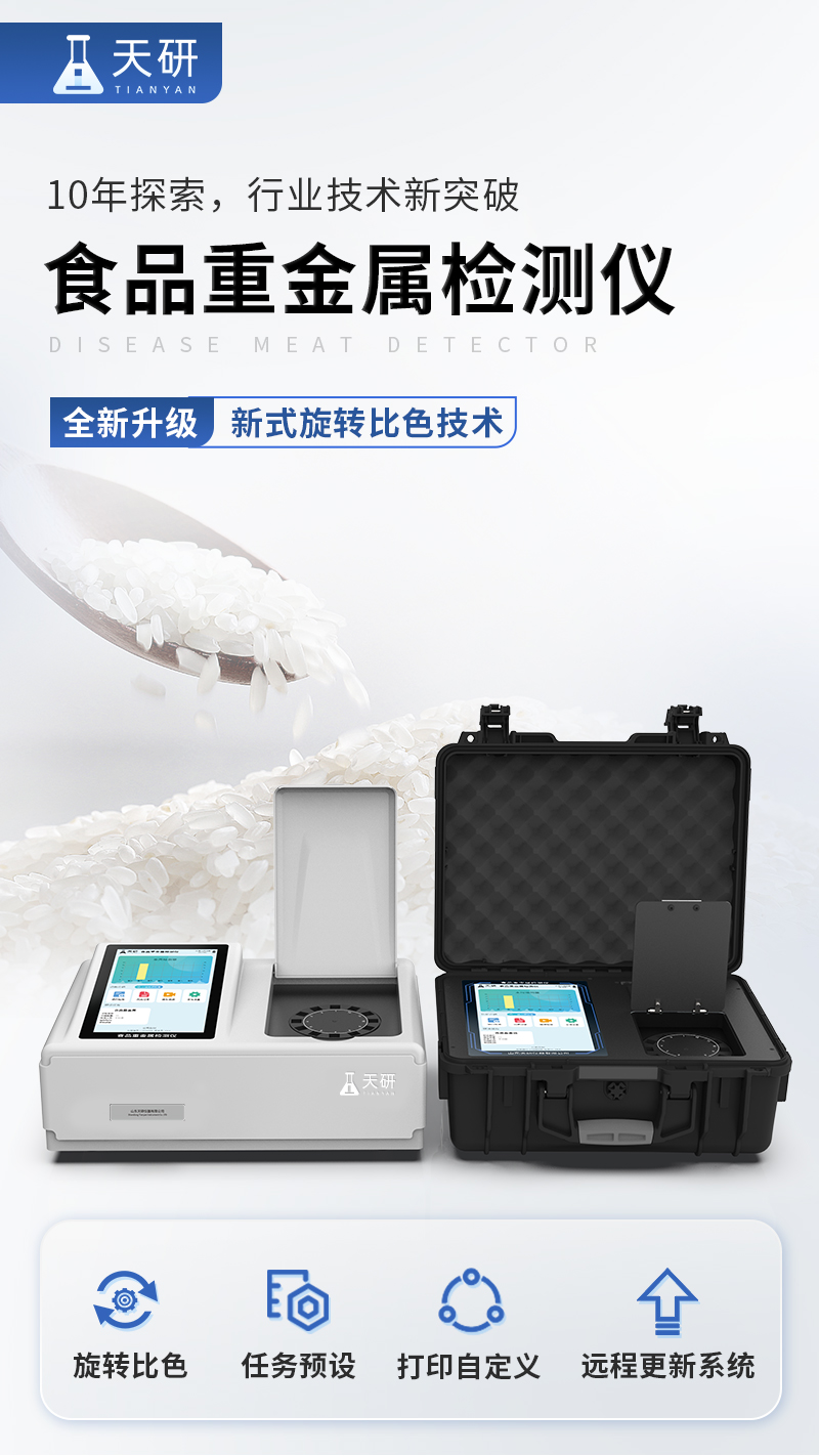 山东天研仪器有限公司生产的重金属检测仪为集成化食品安全快速检测分析设备,采用台式一体化设计,重金属检测仪可广泛应用于大米、粮谷、果品、蔬菜、药材、水产品中重金属铅、镉、六价铬、汞、砷、铁、镍、铝等项目进行快速定量检测,检测项目可根据客户的需求定制,仪器预留其他项目检测程序和端口,根据日后需求可进行远程升级