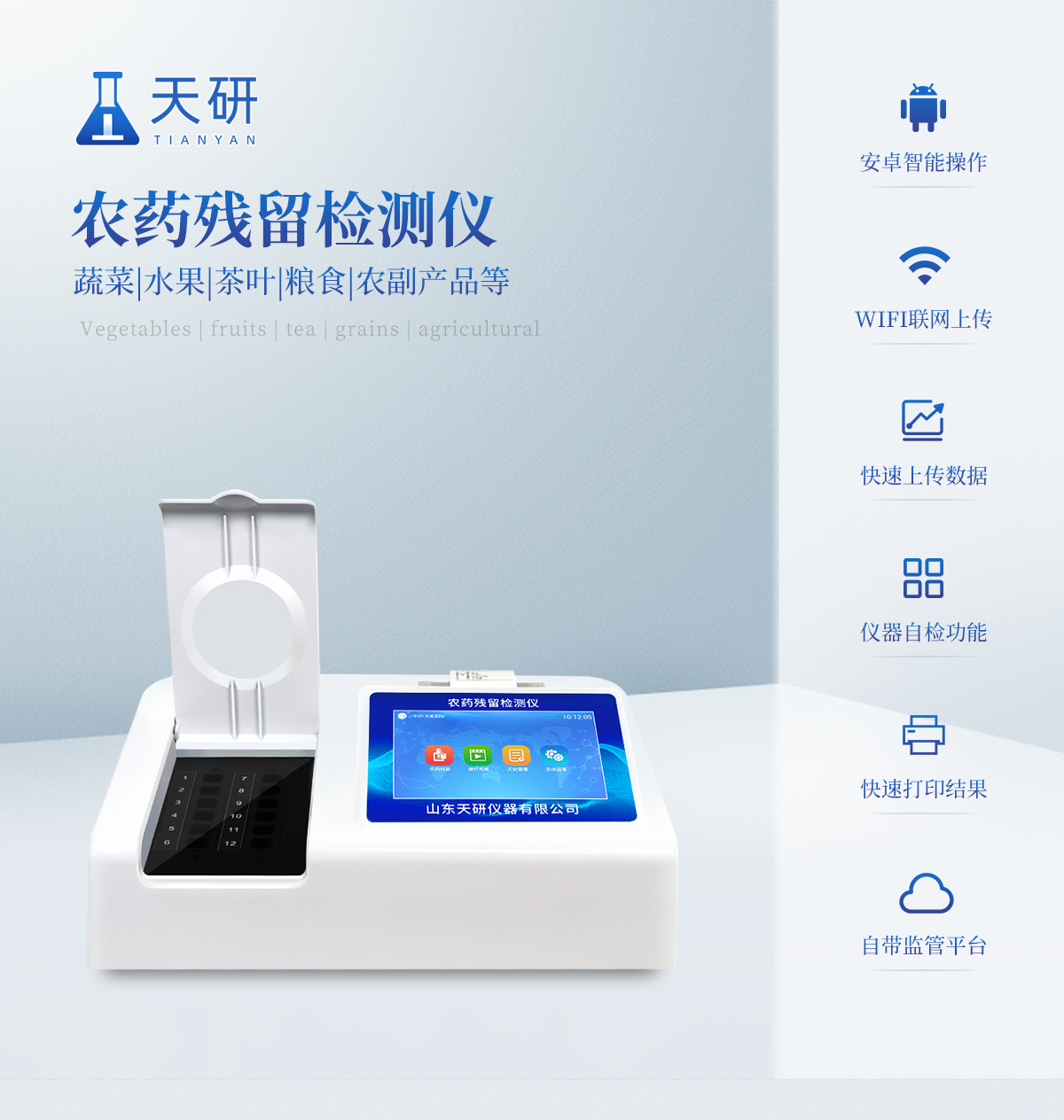 | 乙酰胆碱酯酶和丁酰胆碱酯酶试剂均可以使用,符合国家标准和农业部标准的要求。 | 自动判断样品是否合格,检测结果更加直观。 | 仪器具有100多种蔬菜名称菜单库,分类管理,并可按需添加或删除蔬菜名,编辑蔬菜名称,可直接打印出蔬菜名称。 | 检测通道:12个检测通道,可以同时测试多个样品,循环检测,即放即检,每个样品由程序控制分别独立工作,不会互相干扰。 | 智能操作系统,采用更加人性化操作,主控采用多核处理器,主频1.88Ghz,运转速度更快速,稳定性更强。 | 显示方式:7英寸高灵敏真彩触摸屏显示,人性化中文操作界面,读数直观、简单。 | 打印机采用串口5v打印,可选择手动打印或者自动打印,三分钟出打印结果,打印格式为检测人姓名、吸光度差值、检测时间、检测机构、样品名称及结果判定。 | 光源采用进口超高亮发光二极管,具有低功耗、高精度、稳定性强、光源可控可以关掉不使用的光源,响应速度快等优点。 | 智能恒流稳压,光强自动校准,长时间连续工作光源无温漂现象。 | 仪器具有GPRS远传功能,可插手机卡实现数据远传平台,wifi联网功能,可将数据快速上传电脑,进行数据管理与统计。 | 采用USB2.0接口设计,方便数据的存贮和移动,并可随时与计算机直接相连,并且可用计算机控制仪器。实现数据查询、浏览、分析、统计、打印等。 | 智能化程度高,仪器具有自检功能:具有开机自检和调零功能,具有自动检测重复性功能 | 仪器具有自身保护功能,可设置用户名及密码,防止非工作人员操作等。 | 采用DC12v直流供电,安全系统更高,并且配备6A锂电池充电器。 | 仪器具有重新校准、锁定、恢复出厂设置功能。 |