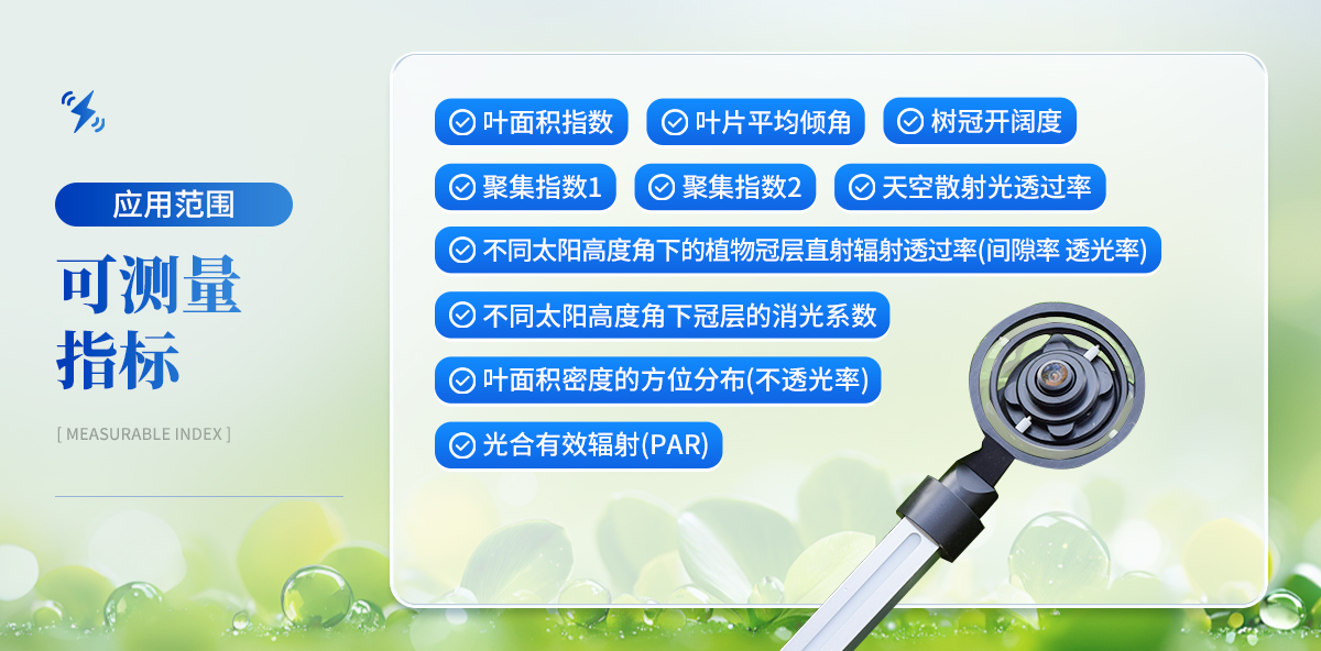 | 鱼眼镜头可自动保持水平状态:专门为植物冠层结构测量设计的小型鱼眼摄像镜头安装在手持式万向平衡接头上,可自动保持镜头处于水平状态,无需三角架; | 鱼眼镜头可以伸入至冠层中:镜头安装在摇臂一端,由于小巧和带有测量杆,可以方便地水平向前或垂直向上伸入到冠层不同高度处,快速地进行分层测量,测出群体内光透过率和叶面积指数垂直分布图; | 图像分析软件:图像分析软件可以任意定义图像分析区域(天顶角可分10区,方位角可分10区)。 | 可屏蔽不合理冠层部分:对不同方向的冠层进行区域性分析时,可以任意屏蔽地物景象和不合理的冠层部分(如缺株、边行问题等)。对不同天顶角起始角和终止角的选择,可以避开不符合计算该冠层结构参数的冠层孔隙条件,通过手动调节阈值,可以更精准的测量出叶面积指数等参数; | 可测量指标 | 叶面积指数 | 叶片平均倾角 | 天空散射光透过率 | 不同太阳高度角下的植物冠层直射辐射透过率 | 不同太阳高度角下冠层的消光系数 | 叶面积密度的方位分布 |