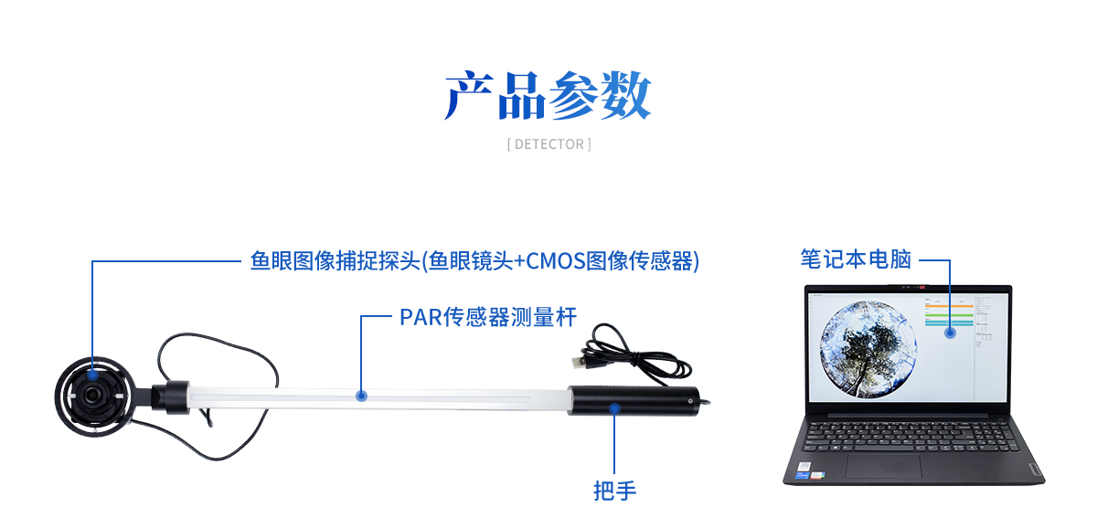 植物冠层图像分析仪由鱼眼图像捕捉探头(由鱼眼镜头及CCD图像传感器组成)、内置25个PAR传感器的测量杆(摇臂)、笔记本电脑、图像采集软件及图像 分析软件、高容量的可充电电池组组成。鱼眼探头安装在一个很轻的摇臂的顶端,它可以获取150°视角的鱼眼图像。图像的显示和存贮由配置的笔记本计算机完 成。