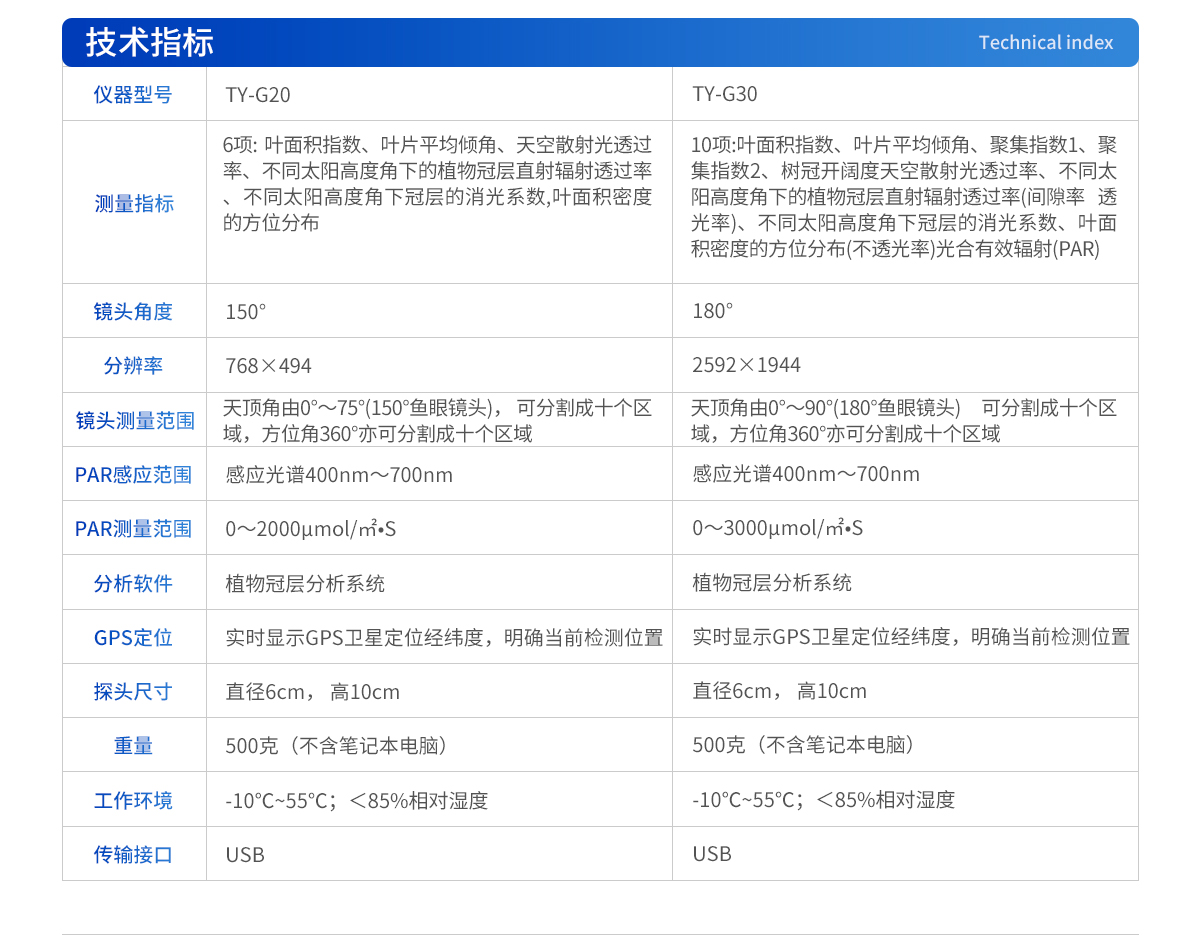 | 镜头角度:150° | 分辨率:768×494pix | 测量范围:天顶角由0°~75°(150°鱼眼镜头)可分割成十个区域,方位角360°亦可分割成十个区域 | PAR感应范围:感应光谱400nm~700nm | 测量范围0~2000μmol/㎡•S | 分析软件:植物冠层分析系统 | 电 源:8.4v可充电锂电池组 | 探头尺寸:直径6cm,高10cm | 总 重 量:500克(不含笔记本电脑) | 传输接口:USB | 工作温度:0~55℃ |