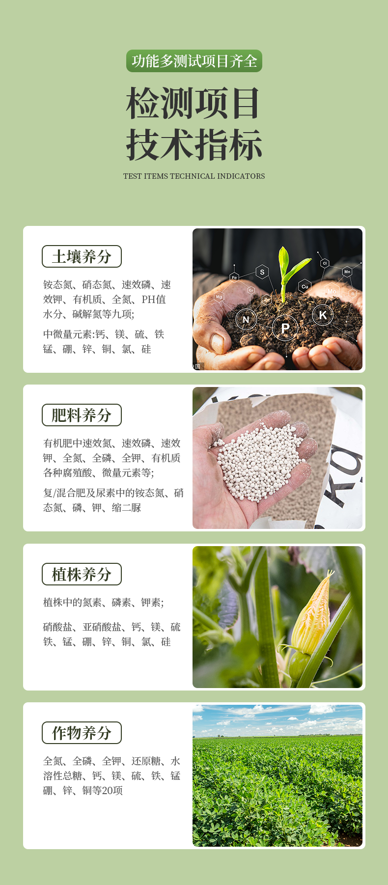 ●单质化肥中的氮、磷、钾; ●复(混)合肥及尿素中的铵态氮、硝态氮、磷、钾、缩二脲; ●有机肥中速效氮、速效磷、速效钾、全氮、全磷、全钾、有机质,各种腐植酸、微量元素(钙、镁、硫、铁、锰、硼、锌、铜、氯、硅、钼)等。 |