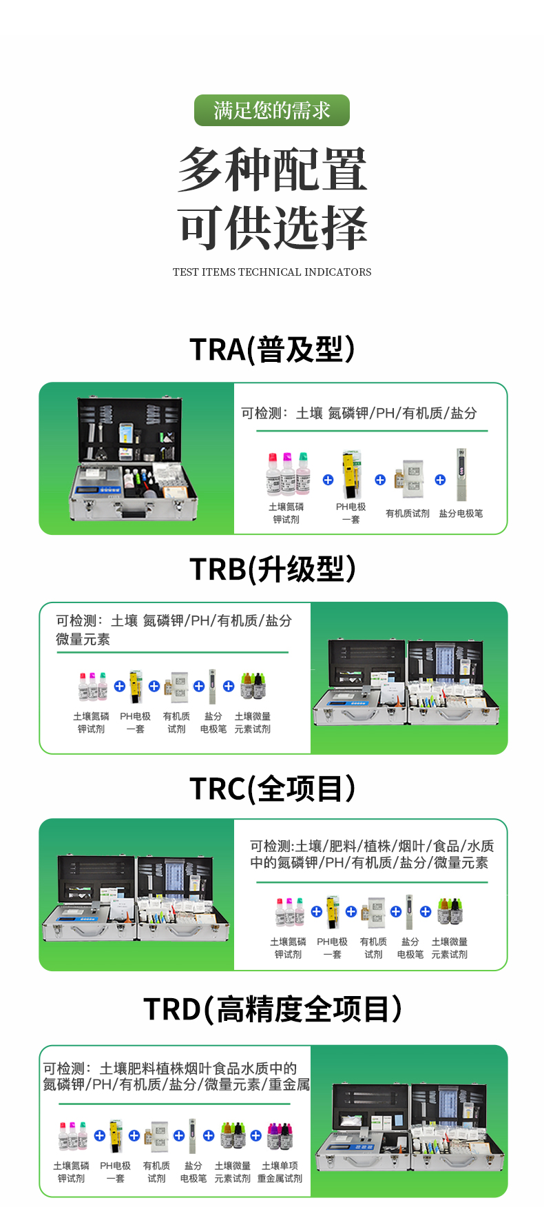 | 全项目土壤肥料养分检测仪功能全:测试项目国内外*全(各类药剂均可选购)。 | 配套齐全:该仪器集药、器、仪为一体,携带方便,相当于一个小型实验室。适于农业服务部门或农资经销商、肥料厂商测土施肥和鉴别肥料真假。 | 操作简便、速度快捷,成品药剂开瓶即用,无须配置。 |