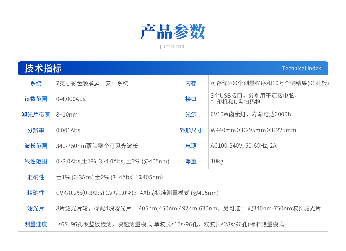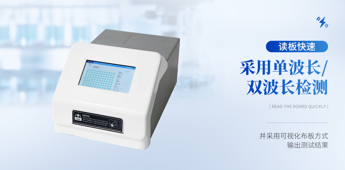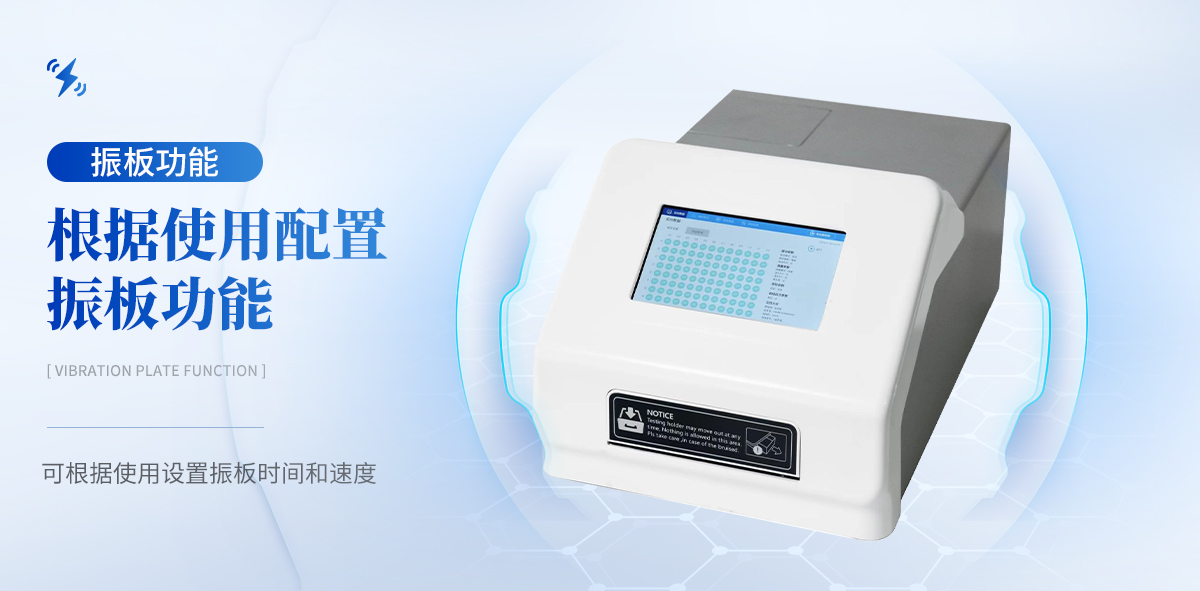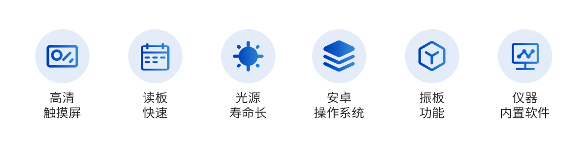 1. 高清触摸屏: 显示使用7英寸彩色触摸屏,分辨率为1280*800像素。 | 2.内置软件: 内置软件可提供仪器的控制和数据分析,可直接外接U盘。 | 3. 光源寿命长: 光源采用6V10W卤素灯,寿命可达2000h。 | 4. 读板快速: 采用单波长,双波长检测读板快速。 | 5. 振板功能: 根据使用配置了振板功能,可根据使用设置振板时间和速度。 | 6. 操作系统: 配备自主研发的安卓操作系统可单机独立使用,同时配置多种数据 输出接口,方便不同的数 据传输和处理。 | 7. 可视化布板: 并采用可视化布板方式输出测试结果。 | 8. 设置吸光度范围:0~4.000Abs,满足不同测量要求,并配备了8组滤光片轮,标配4组滤光片,根据使用 可选配340 nm~750nm波长的滤光片组合使用。设计合理无需打 开机盖就可更换光源和滤光片。 | 9.检测数据:使用自动校准、定位系统算法使检测数据更精准、可靠。 | 10. 配置对光路: 配置对光路,机械运动等进行自检和诊断校对功能。 |