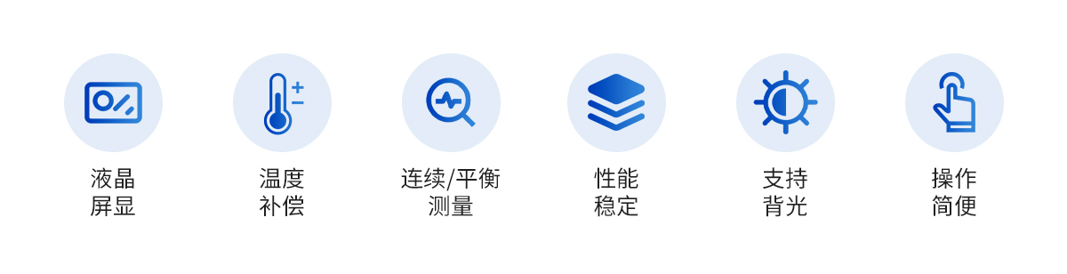 | 1.显示标定、测量和数据稳定符号及温度、电极斜率。 | 2.支持背光和恢复出厂、手动温补、连续测量模式功能。 | 3.支持数据存储、删除和查阅(PH50-3/4/5)及数据打印和传输(PH50-5)。 | 4.支持自动识别NIST、USA、EURO*多5点标定功能。 | 5.支持平衡测量模式和数据锁定功能(PH50-3/4/5) 。 | 6.支持自动关机(PH50-3/4/5)、自动温补(PH50-4/5)。 |