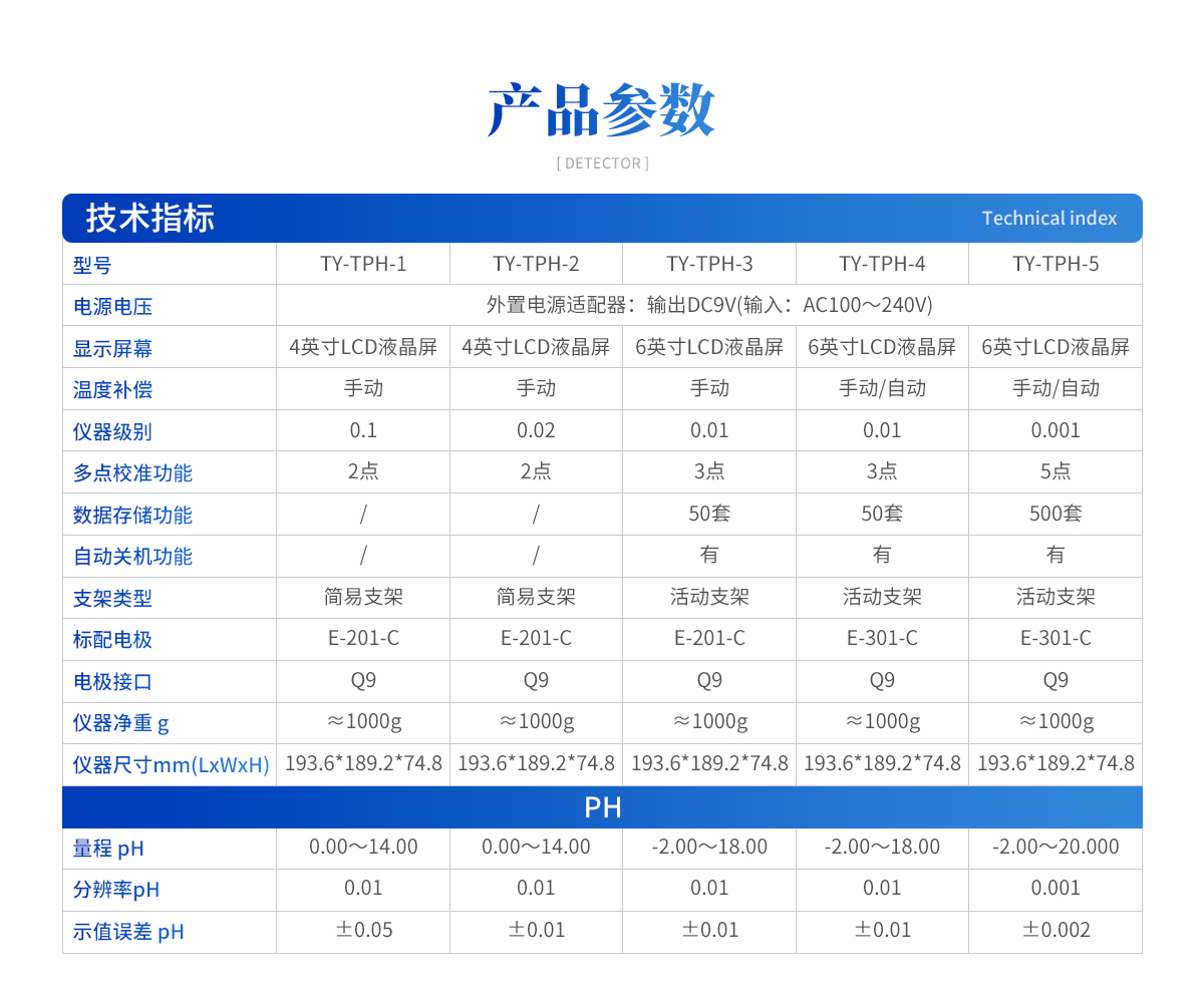 产品概述:TPH系列台式酸度计是一台实验室常规分析测量仪器,它适用于医药、环保、卫生、地质探矿、高等院校和科研单 位的实验室,测量样品溶液的pH值。产品优点:1.显示标定、测量和数据稳定符号及温度、电极斜率。2.支持背光和恢复出厂、手动温补、连续测量模式功能。3.支持数据存储、删除和查阅(PH50-3/4/5)及数据打印和
