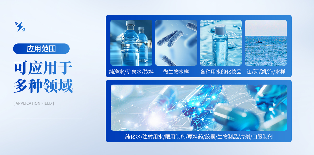 | 1.制药:纯化水、注射用水、原料药及口服液、片剂、胶囊、生物制品及制剂的微生物限度检查。 | 2.疾控:空调冷凝水、生活饮用水等水质的细菌总数检查,致病菌检测。 | 3.食品:饮料、矿泉水、纯净水的菌落总数检查。 | 4.化工:各种需测试微生物的水样检测。 |