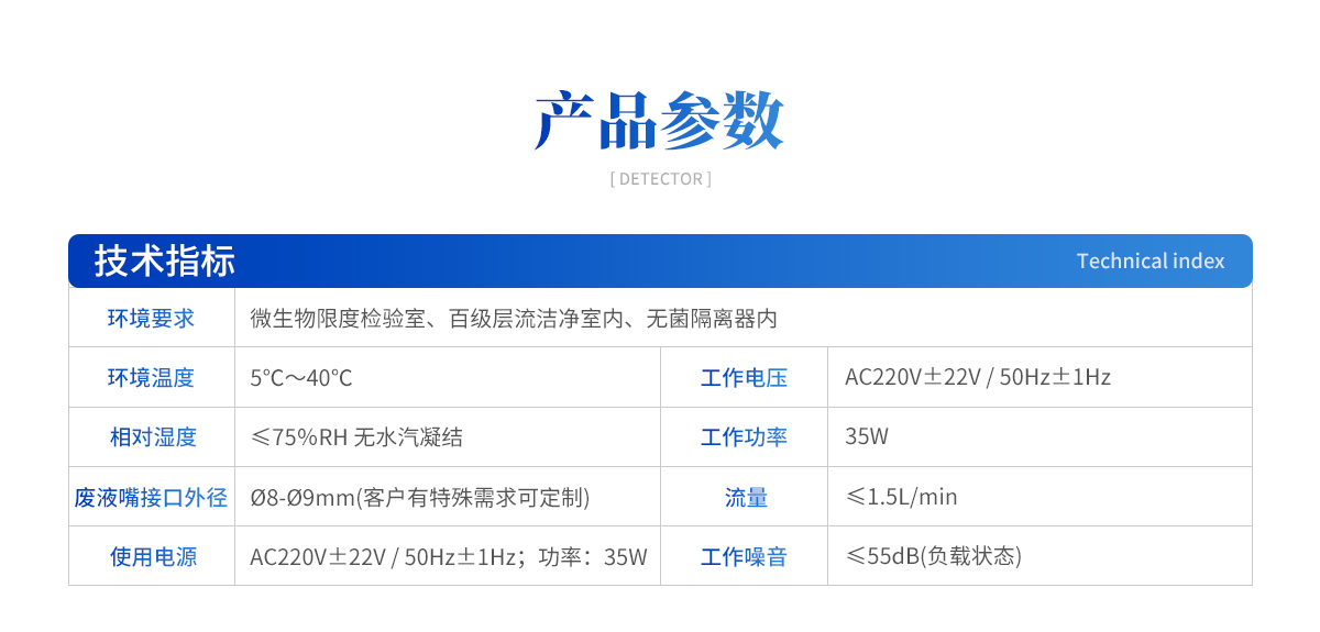 | ① 环境要求:微生物限度检验室、百级层流洁净室内、无菌隔离器内 ② 环境温度:5℃~40℃ ③ 相对湿度:≤75%RH 无水汽凝结 ④ 废液嘴接口外径:Ø8-Ø9mm(客户有特殊需求可定制) ⑤ 使用电源:AC220V±22V / 50Hz±1Hz;功率:35W |
