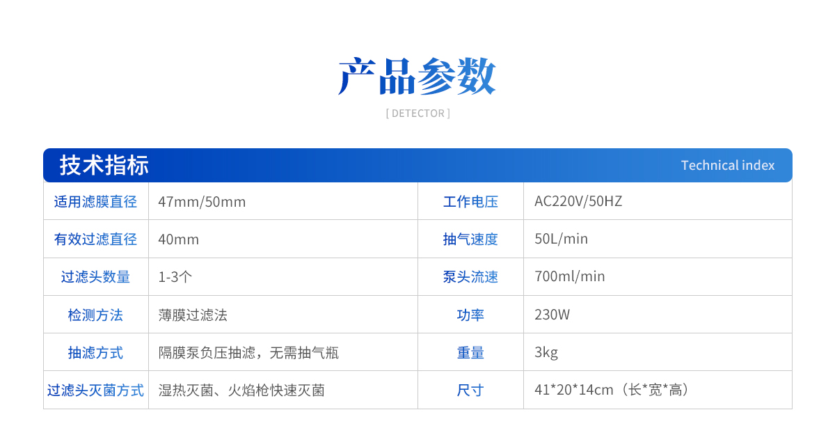 | 1、适用滤膜直径:47mm/50mm 2、有效过滤直径:40mm 3、过滤头数量:1-3个; 4、检测方法:薄膜过滤法 5、抽滤方式:隔膜泵负压抽滤,无需抽气瓶 6、过滤头灭菌方式:湿热灭菌、火焰枪快速灭菌 7、尺寸:41*20*14cm(长*宽*高) 8、重量:3kg 9、功率:230W 10、工作电压:AC220V/50HZ 11、噪音小于30dB 12、物理按钮开关 13、可选择单头、三头结构,选型丰富 14、抽气速度:50L/min 15、泵头流速:700ml/min |