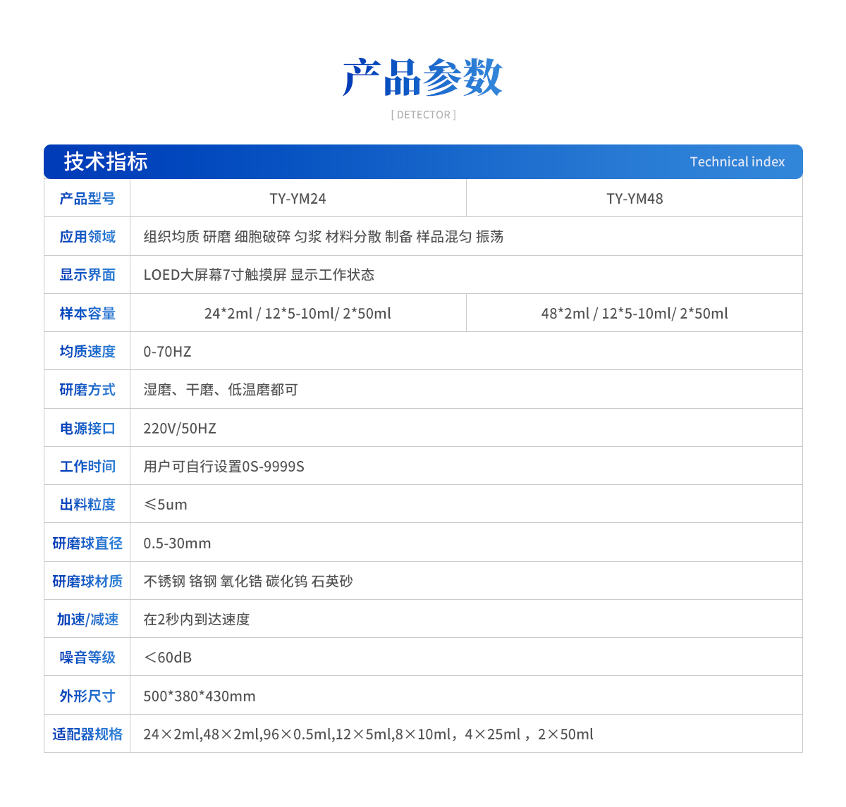 显示界面:LOED大屏幕7寸触摸屏 显示工作状态 样本容量:24*2ml / 12*5-10ml/ 2*50ml 均质速度:0-70HZ 研磨方式:湿磨 干磨 低温磨都可 电源接口:220V/50HZ 工作时间:用户可自行设置0S-9999S 出料粒度:≤5um 研磨球直径:0.5-30mm 研磨球材质:不锈钢 铬钢 氧化锆 碳化钨 石英砂 加速减速:加速/减速 在2秒内到达速度 噪音等级:<60dB 外形尺寸:500*380*430mm 适配器规格:24×2ml,48×2ml,96×0.5ml,12×5ml,8×10ml,4×25ml ,2×50ml |
