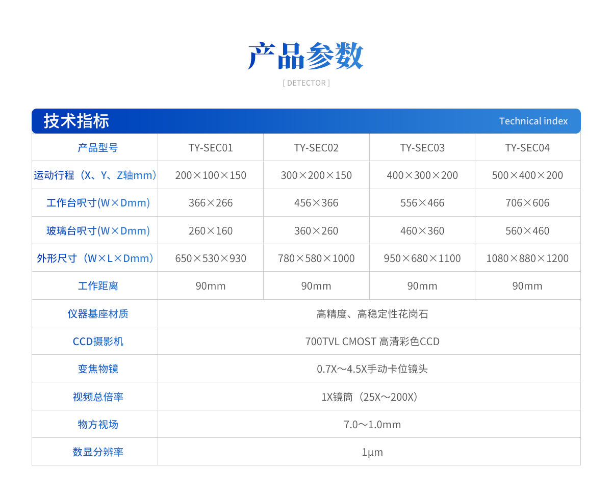 | 高稳定性高精度花岗石材质 | 700TVL COMST模拟信号相机 | 0、7~4、5 X手动卡位镜头(莱斯) | 高精度位移传感电子尺,分辨率:1µm (精微) | 咸阳蓝博P级精密V型导轨(LB) | 西德无牙光杆精密传动(西德)、高精密T型丝杆(特制) | LED恒流环形冷光源 | 绿色单颗LED冷光源+双组透镜均光平行底光模组 | UWC3200 | DTV 2、5T手动影像测量软件 | DTV 定制 | AC/DC |