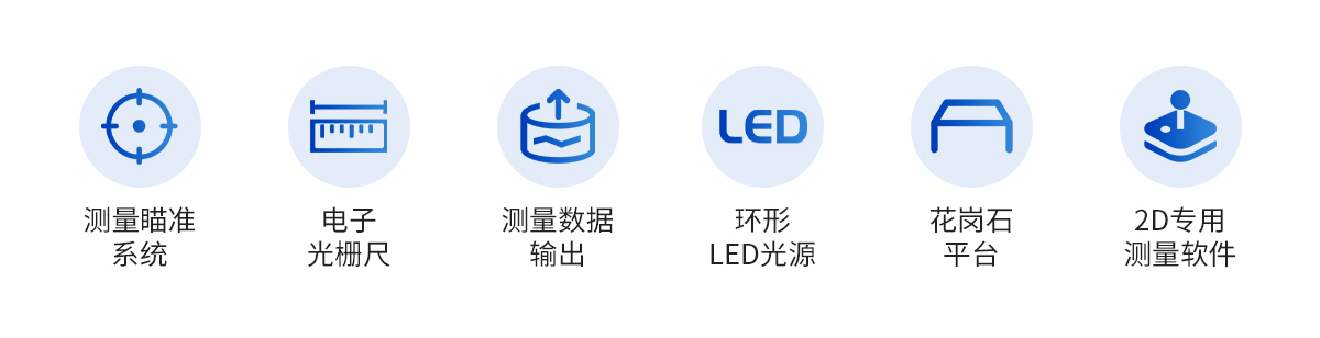 | 仪器基座 | CCD | 镜头 | 光栅尺 | 导轨 | 传动 | 表面光源 | 底光源 | 数据采集卡 | 影像测量软件 | 光学校正片 | 电缆 |