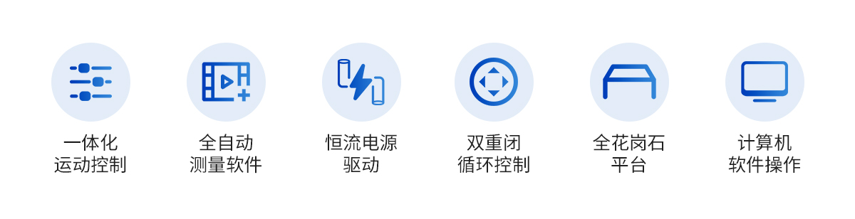 | 仪器基座 | CCD | 镜头 | 光栅尺 | 导轨 | 传动 | 电机 | 运动控制 | 程控光源 | 操纵杆 | 全自动测量软件 | 加密狗 | 光学校正片 | 电压 | 计算机 |
