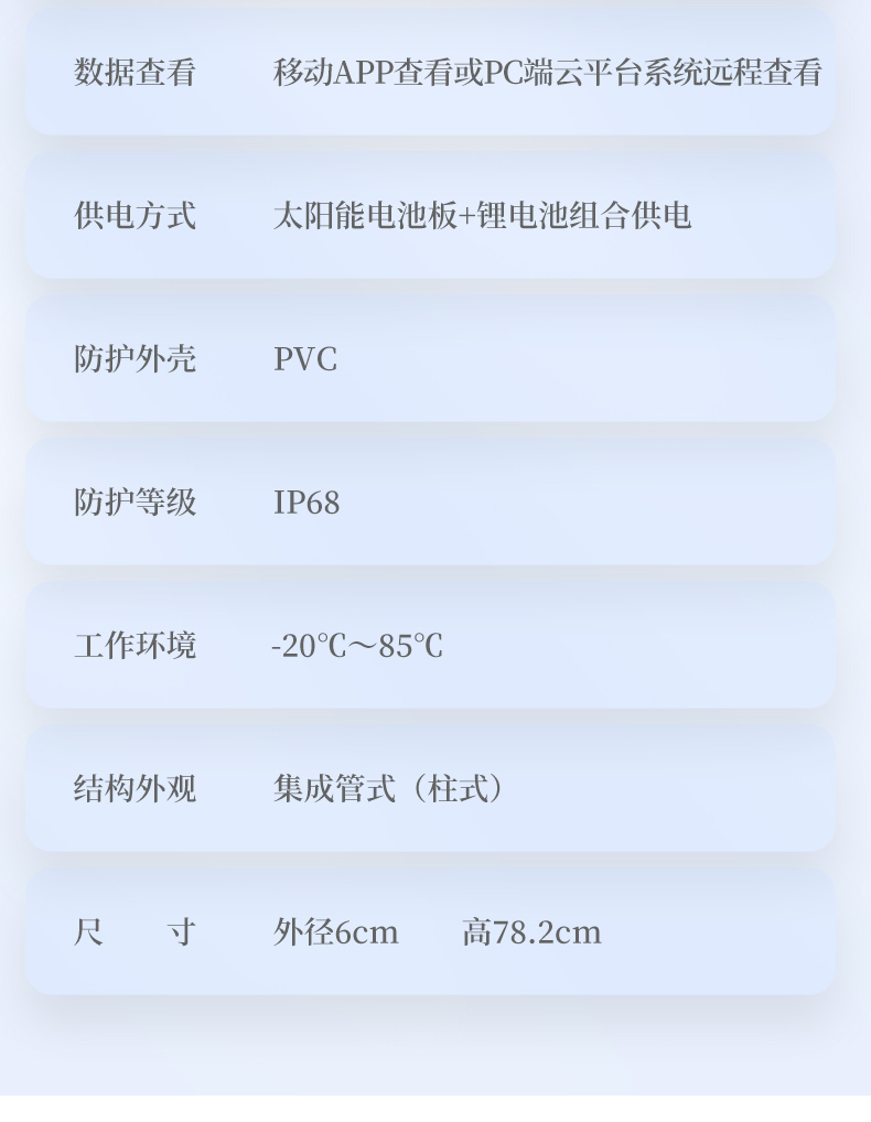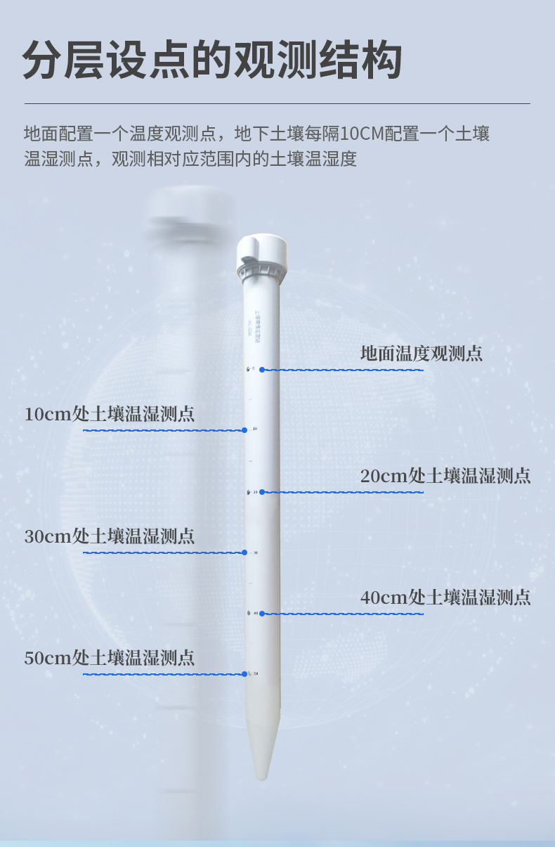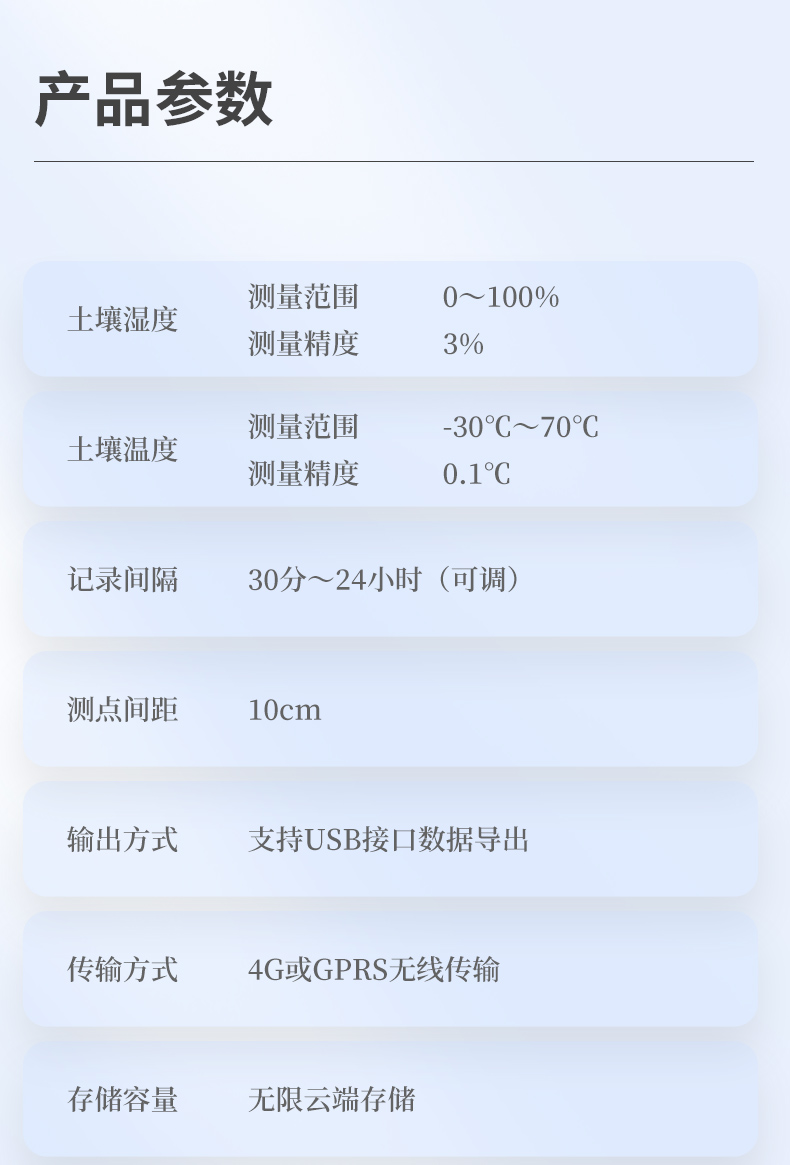 | 1、工作温度:-40℃-80℃ | 2、土壤湿度:0~100%(±5%) | 3、土壤温度:-15℃~35℃(±0.5℃) | 4、测点间距:10cm | 5、供电方式:10-30V宽直流供电 | 6、外壳:PVC塑料管 | 7、防护等级:地面以下部分IP68 | 8、输出信号:RS485(Modbus协议) | 9、功耗:四层 0.9W |