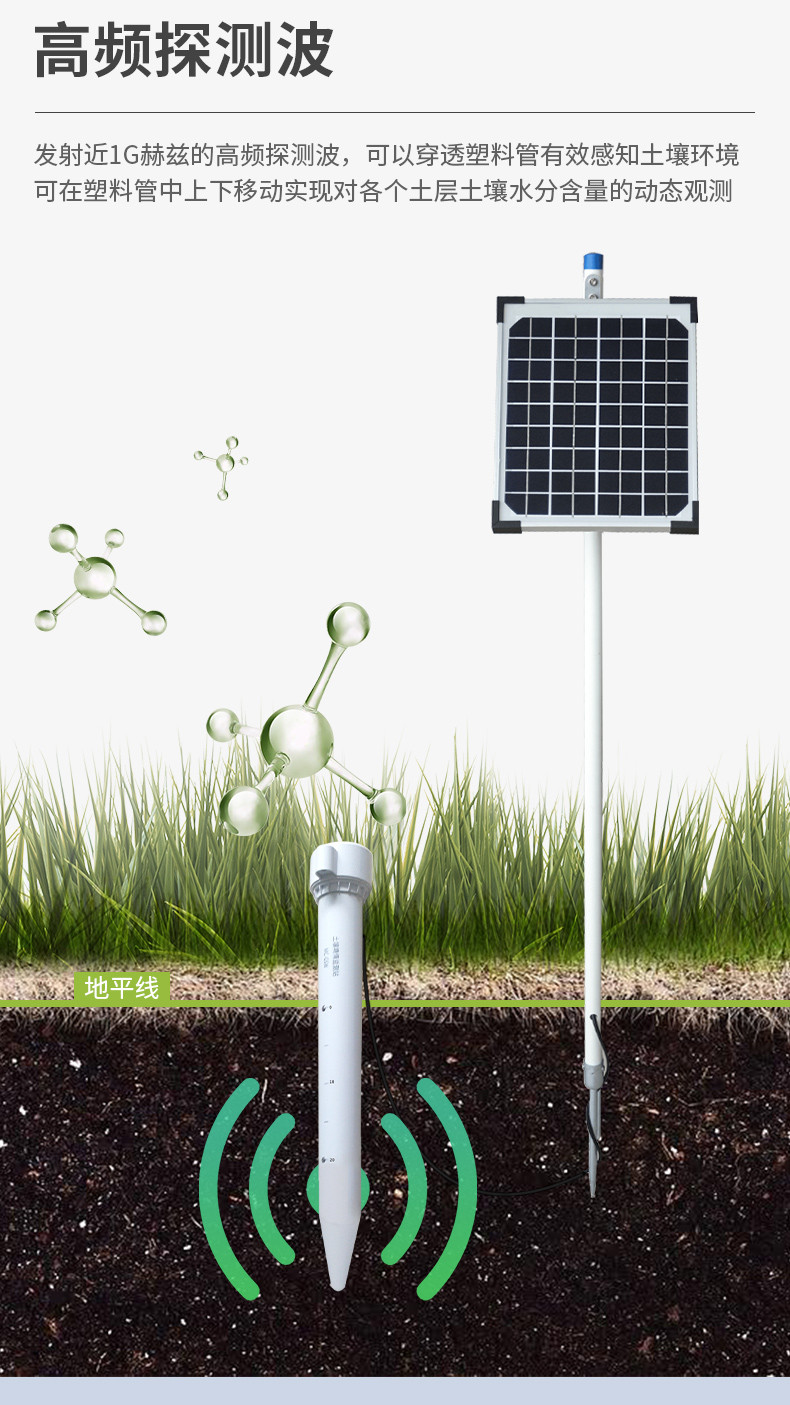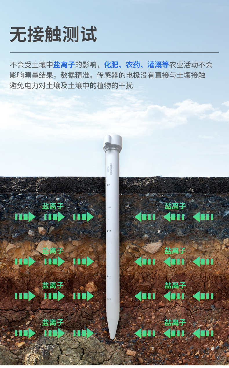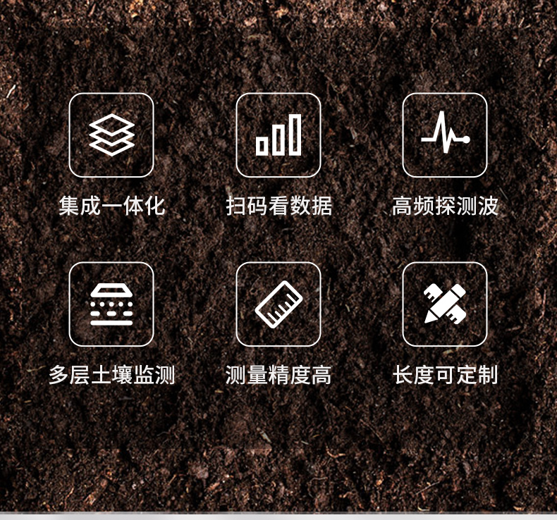 | 1、外壳采用PVC塑料管,内部发射近1G赫兹的高频探测波,可以穿透塑料管,有效感知土壤环境。 | 2、不受土壤中盐离子的影响,化肥、农药、灌溉等农业活动不会影响测量结果,数据精准。 | 3、传感器的电极没有直接与土壤接触,避免电力对土壤及土壤中的植物的干扰。 | 4、产品采用标准的Modbus-RTU485通信模式,最远通信2000米。 | 5、支持10-30V宽电压充电。 | 6、一体式可同时监测四层土壤温湿度。 |