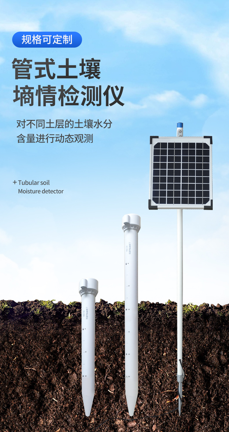 管式土壤墒情监测仪是一款基于介电常数原理而研发的传感器,可以针对不同土层的水分、温度含量进行快速、准确、全面监测。该传感器监测层数支持定制,**可测三层土壤温湿度,**可测十层土壤温湿度。 该产品可快速、全面了解土壤墒情信息,为抗旱救灾提供决策支持,最大限度地减轻
