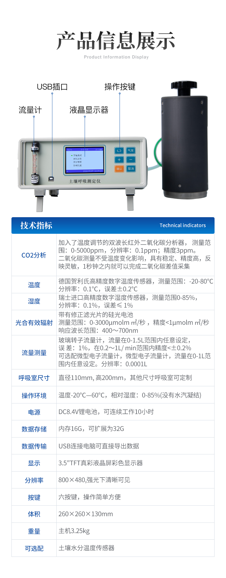 | 1、 CO2分析:加入了温度调节的双波长红外二氧化碳分析器, 测量范围:0-5000ppm,分辨率:0.1ppm; 精度3ppm。二氧化碳测量不受温度变化影响,具有稳定、精度高,反映灵敏,1秒钟之内就可以完成二氧化碳差值采集。 | 2、温度:德国贺利氏高精度数字温度传感器,测量范围:-20-80℃,分辨率:0.1℃,误差±0.2℃ | 3、 湿度: 瑞士进口高精度数字湿度传感器,测量范围0-85%,分辨率:0.1%,误差≤ 1% | 4、光合有效辐射:带有修正滤光片的硅光电池,测量范围:0-3000µmolm ㎡/秒 ,精度<1µmolm> | 5、流量测量:玻璃转子流量计,流量在0-1.5L范围内任意设定, 误 差:1%,在0.2~1L/ min范围内精度<±0.2%。可选配微型电子流量计,微型电子流量计,流量在0-1l范围内任意设定。分辨率:0.0001l<> | 6、 呼吸室尺寸:直径110mm, 高200mm,其他尺寸呼吸室可定制。 | 7、操作环境:温度-20℃—60℃,相对湿度:0-85%(没有水汽凝结) | 8、 电源:DC8.4V锂电池,可连续工作10小时 | 9、数据存储:内存16G,可扩展为32G。 | 10、 数据传输:USB连接电脑可直接导出数据。 | 11、显 示:3.5"TFT真彩液晶屏彩色显示器 | 12、 分辨率 800×480,强光下清晰可见 。 | 13、按 键:六按键,操作简单方便 | 14、 体积:260×260×130mm | 13、 重量:主机3.25kg | 14、 可选配:土壤水分温度传感器 |