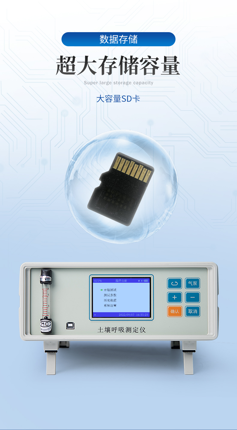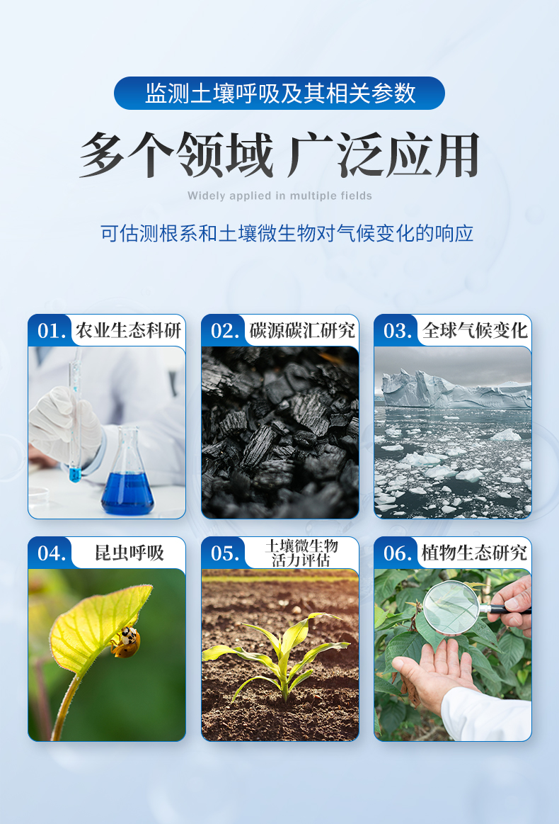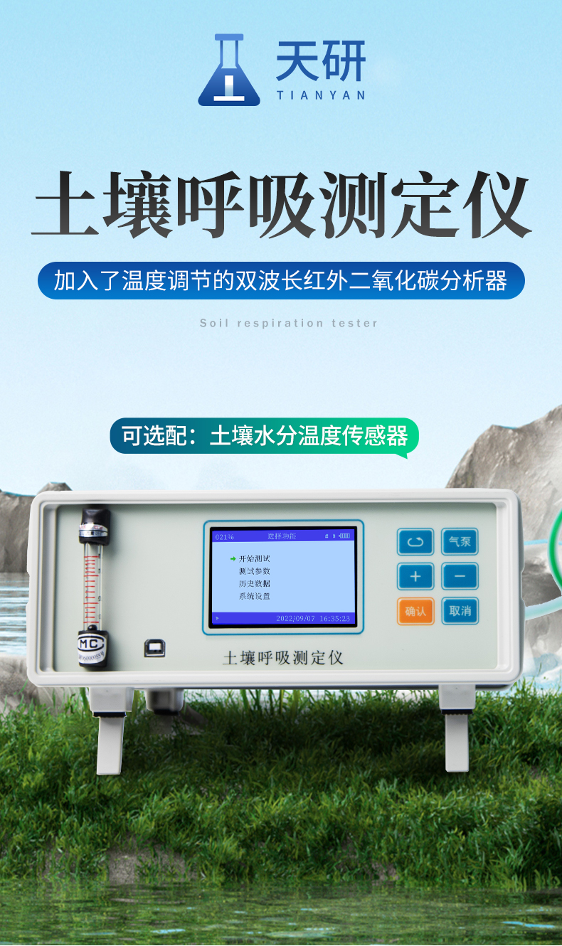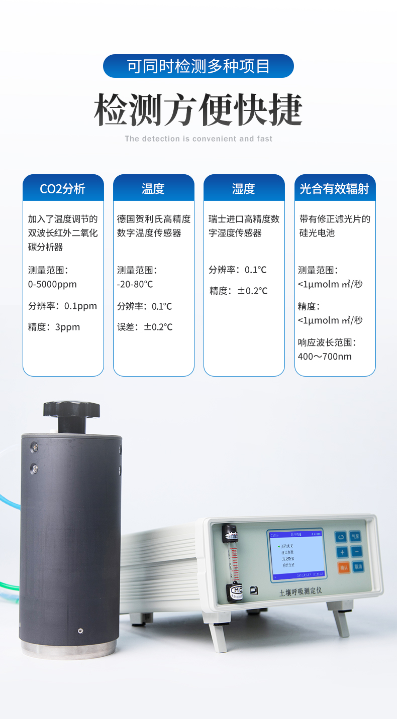 土壤呼吸是土壤生态系统碳素循环的一个重要过程,是土壤碳素同化异化平衡作用的结果,也是碳素由陆地生态系统返回大气的主要途径,是土壤中生命活动的表征,准确测定其释放量是评价生态系统中生物学过程的关键;通过对土壤呼吸及其相关参数的监测,可估测根系和土壤微生物对气候变化的响应。土壤CO2通量在时间和空间上受多种复杂物理和生物过程影响,长期、连续、准确的测量土壤碳通量,对陆地生态系统碳通量研究具有重要的意义。土壤呼吸测定仪可以同时显示呼吸室内部的CO2浓度、温度和湿度变化以及外部光合有效辐射强度。广泛应用于农业生态科研、碳源碳汇研究、全球气候变化、土地利用方式改变、生态修复研究、土壤微生物活力评估、植物生态研究、昆虫呼吸、根系呼吸以及水果贮藏。 产品适用于农业农村局、高校、科研院所、水利局、环保局、企事业单位。