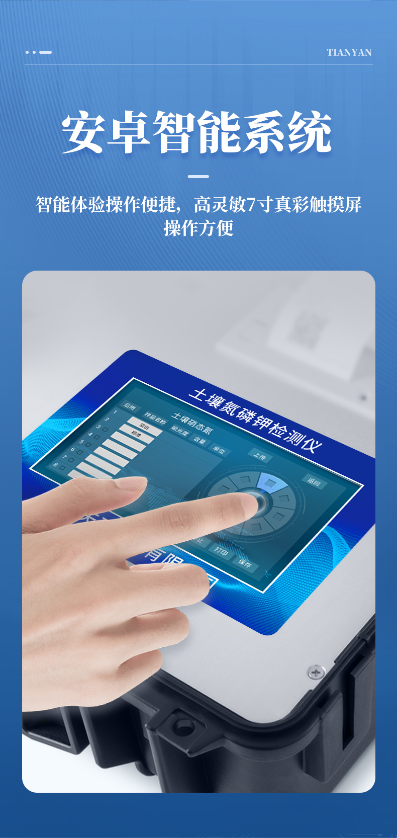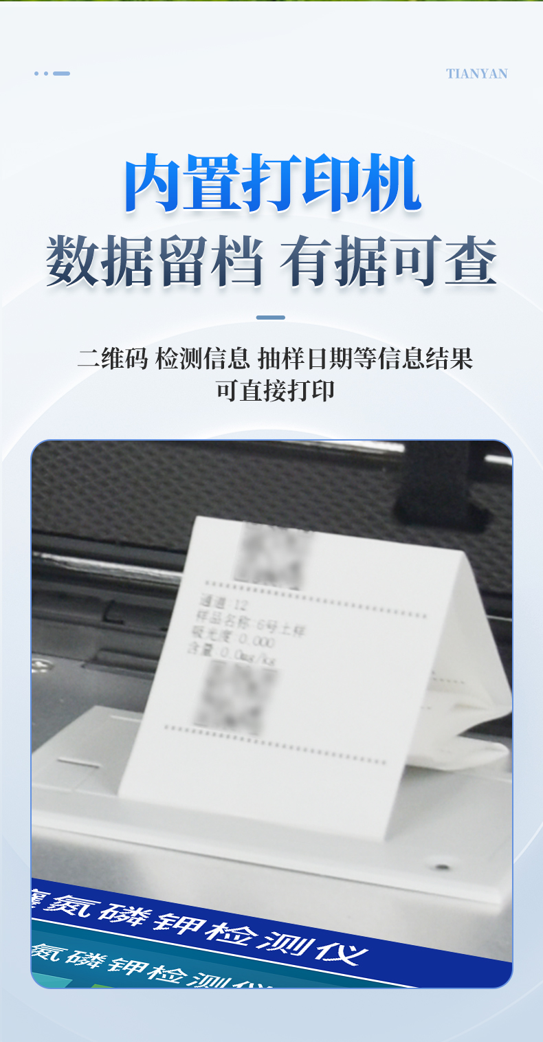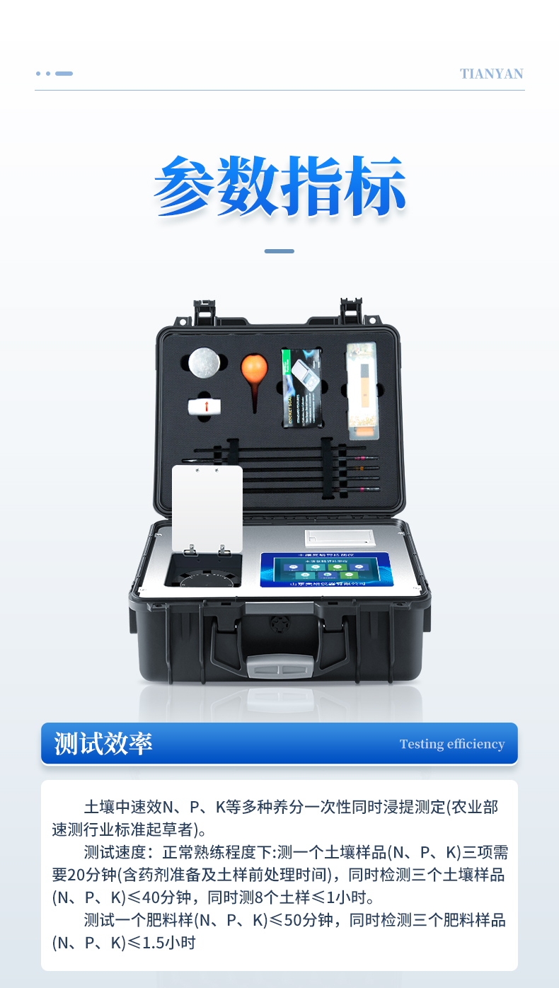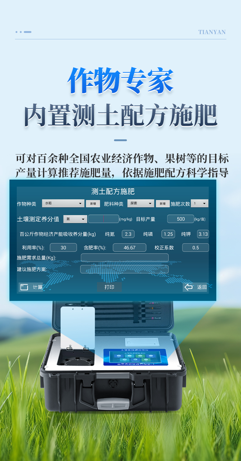 土壤氮磷钾检测仪器集药、器、仪为一体,携带方便,相当于一个小型移动实验室,无需用户自配附件,亦可灵活野外流动测试。适于农业服务部门或农资经销商、合作社、肥料厂商、大种植户测土施肥和鉴别肥料真假。 检测功能全:测试项目国内外全面,除标配试剂外,其他各类药剂均可加配选购。