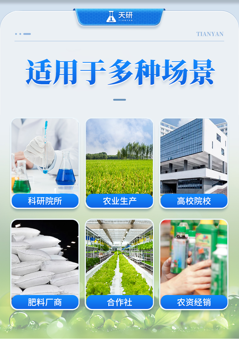 1、土壤养分:●土壤铵态氮、土壤有效磷、土壤速效钾、土壤硝态氮、土壤水解氮、土壤全氮、土壤全磷、土壤全钾、土壤有机质(丘林法)、土壤有机质(浸提法)、土壤总有机碳、土壤碳氮比、PH值、含盐量、水分。 ●土壤中微量元素:土壤钙、土壤镁、土壤硫、土壤硅、土壤硼、土壤铁、土壤铜、土壤锰、土壤锌、土壤氯、土壤钼; ●土壤重金属:土壤铅、土壤砷、土壤镉、土壤铬、土壤汞、土壤镍、土壤铝、土壤氟、土壤钛、土壤硒。 | 2、肥料养分:●单质肥:氮肥中铵态氮、肥料硝态氮、尿素氮、缩二脲、磷肥中磷、磷肥中水溶性磷、钾肥中钾; ●复合肥全氮、复合肥全磷、复合肥全钾; ●有机肥全氮、有机肥全磷、有机肥全钾、有机肥硝态氮、有机肥速效磷、有机肥速效钾、有机肥酸解氮、有机质; ●水溶性腐植酸(风化煤)、水溶性腐植酸(褐煤)、水溶性腐植酸(泥炭)、游离态腐植酸(风化煤)、游离态腐植酸(褐煤)、游离态腐植酸(泥炭); ●水溶肥全氮、水溶肥全磷、水溶肥全钾; ●叶面肥全氮、叶面肥全磷、叶面肥全钾; ●各种肥料微量元素:肥料钙、肥料镁、肥料硫、肥料硅、肥料硼、肥料铁、肥料铜、肥料锰、肥料锌、肥料氯、肥料钼; ●肥料重金属:肥料铅、肥料砷、肥料镉、肥料铬、肥料汞、肥料镍、肥料铝、肥料氟、肥料钛、肥料硒。 | 3、鲜作物营养:●作物硝态氮、作物铵态氮、作物磷、作物钾; ●作物中微量元素:作物钙、作物镁、作物硫、作物硅、作物硼、作物铁、作物铜、作物锰、作物锌、作物氯、作物钼; ●作物中硝酸盐、亚硝酸盐。 | 4、干植株营养:●植株全氮、植株全磷、植株全钾 | 5、烟叶营养:●全氮、全磷、全钾、还原糖、水溶性总糖、硼、锰、铁、铜、钙、镁等20项。 | 6、食品(水果、蔬菜等):●硝酸盐、亚硝酸盐、重金属(铅、铬、镉、砷、汞)等项。 | 7、水质中:●铵态氮、水中磷、水中钾、硝酸盐、亚硝酸盐、硬度、PH、铁、铜、锰、锌、硼、氯、硫、硅、钼等 |