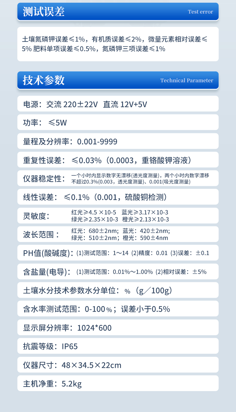 | 1、电源:交流 220±22V 直流 12V+5V(仪器内置锂电池也可用车载电源) | 2、功率: ≤5W | 3、量程及分辨率:0.001-9999 | 4、重复性误差: ≤0.02%(0.0002,重铬酸钾溶液) | 5、仪器稳定性:一个小时内显示数字无漂移(透光度测量);两个小时内数字漂移不超过0.3%(0.003,透光度测量)、0.001(吸光度测量)。 | 6、线性误差: ≤0.1%(0.001,硫酸铜检测) | 7、灵敏度:红光≥4.5 ×10-5 蓝光≥3.17×10-3 绿光≥2.35×10-3 橙光≥2.13×10-3 | 8、波长范围 :红光:680±2nm; 蓝光:420±2nm; 绿光:510±2nm;橙光:590±4nm | 9、PH值(酸碱度): (1)测试范围:1~14 (2)精度:0.01 (3)误差:±0.1 | 10、含盐量(电导):(1)测试范围:0.01%~1.00% (2)相对误差:±5% | 11、土壤水分技术参数水分单位:﹪(g/100g);含水率测试范围:0-100﹪;误差小于0.5% | 12、显示屏分辨率:1024*600 | 13、抗震等级:IP65 | 14、仪器尺寸:48×34.5×22cm。 | 15、主机净重:5.2kg | 16、包装尺寸:510*390*375mm | 17、包装重量:11.5kg |