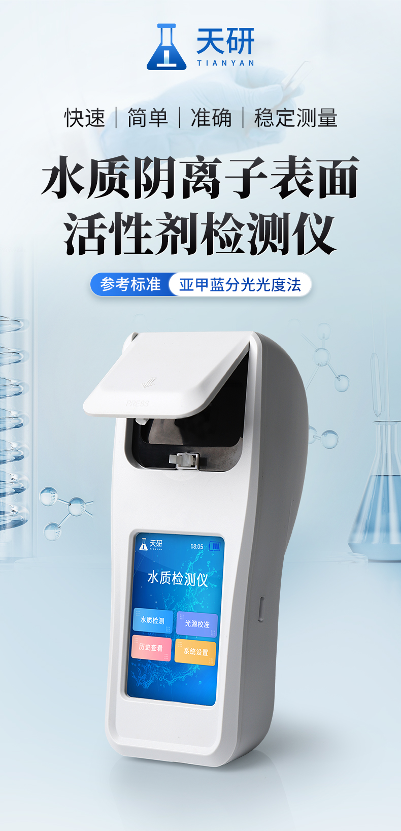 便携式阴离子表面活性剂检测仪参考《水质 阴离子表面活性剂的测定 亚甲蓝分光光度法》方法设计制造,本仪器采用高精度长寿命冷光源,可“快速、简单、准确、稳定”进行测量,仪器广泛应用于饮用水、地表水、生活污水水、废水等的水质阴离子表面活性剂含量的测定。