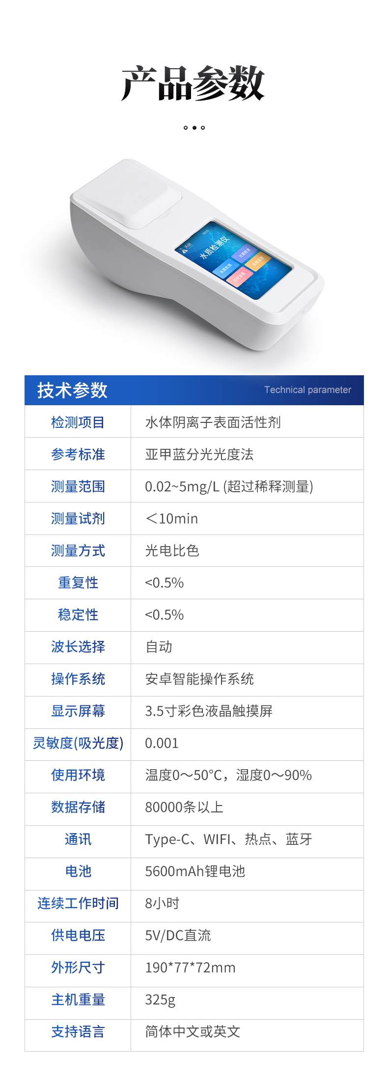 | 检测项目:水体阴离子表面活性剂; | 参考标准:亚甲蓝分光光度法; | 测量范围:0.02~5mg/L (超过稀释测量); | 测量时间:<10min; | 测量方式:光电比色; | 重复性:<0.5%; |