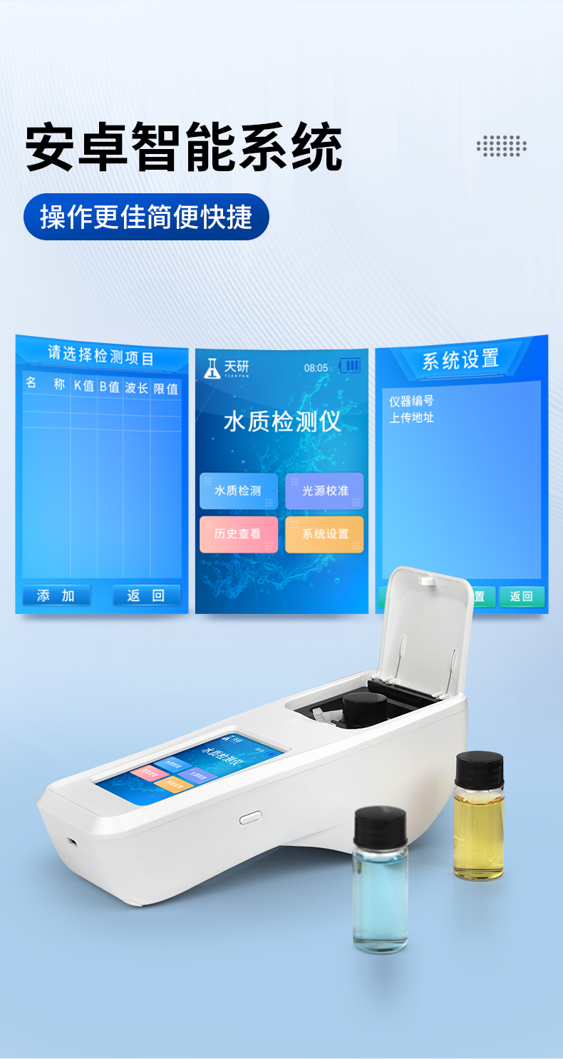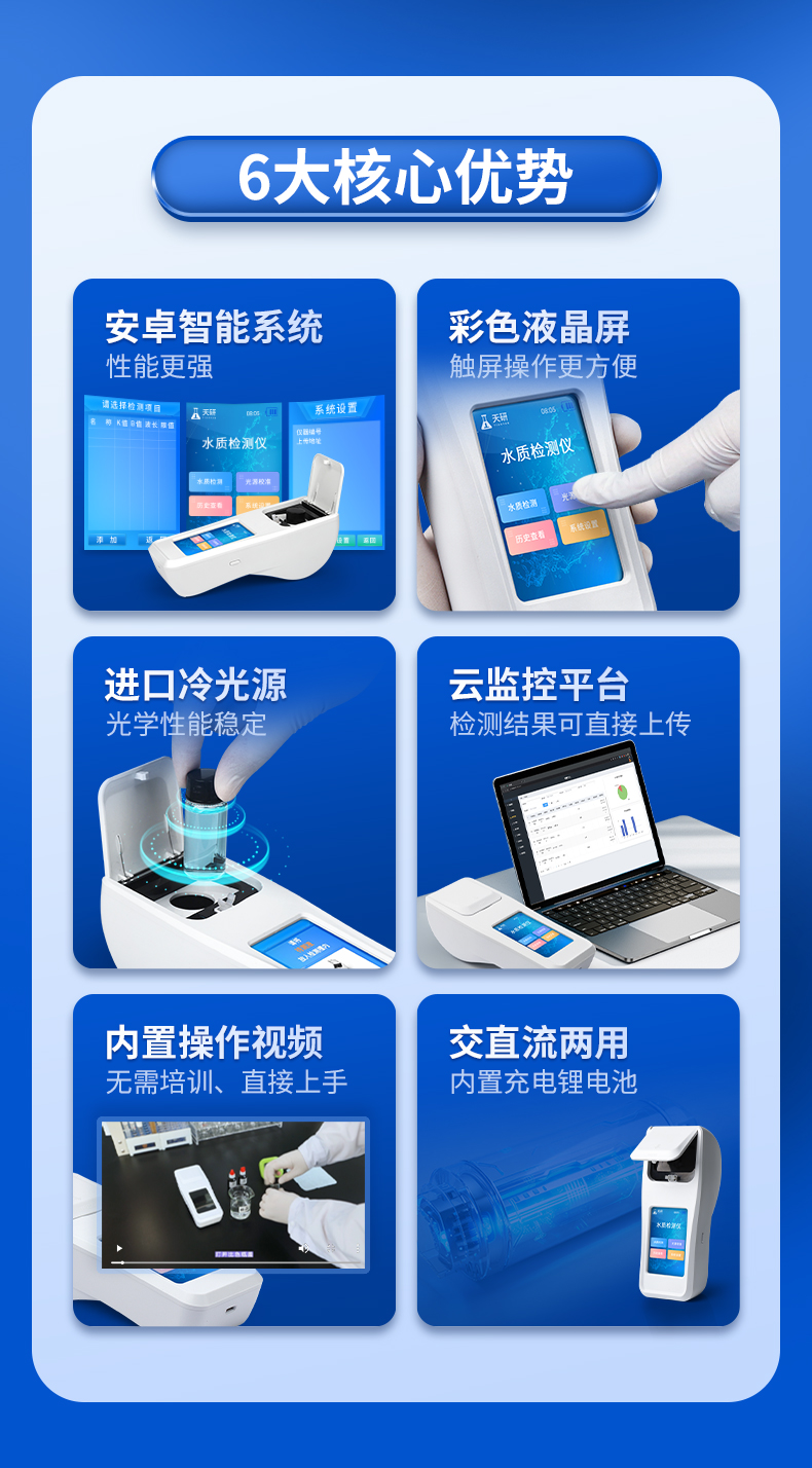 | 1、安卓智能系统,操作更佳简便快捷; | 2、配置云监控平台,检测结果可直接无线传至平台,进行水质长短期分析,辅助管理; | 3、内置操作流程、操作简单、无需培训、直接上手; | 4、检测速度更快,现场读取数据; | 5、便携式体积小,重量轻,方便户外检测; | 6、外形小巧美观,工作稳定免维护,具有较好的性价比; | 7、采用进口冷光源,光学性能稳定,寿命长达10万小时; | 8、交直流两用,内置充电锂电池,环保耐用可支持连续室内外工作。 |