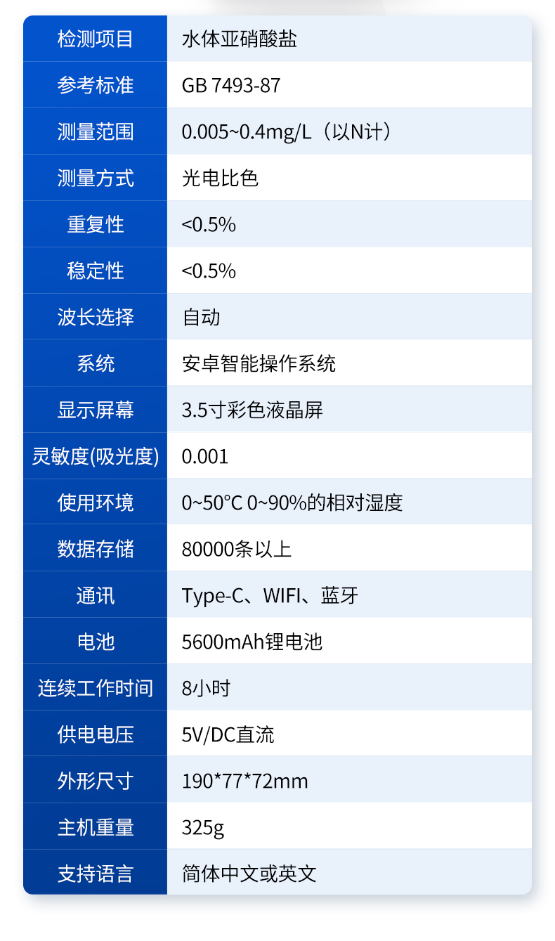 | 检测项目:水体亚硝酸盐; | 参考标准:GB 7493-87; | 测量范围:0.005~0.4mg/L(以N计); | 测量方式:光电比色; | 重复性:<0.5%; | 稳定性:<0.5%; |