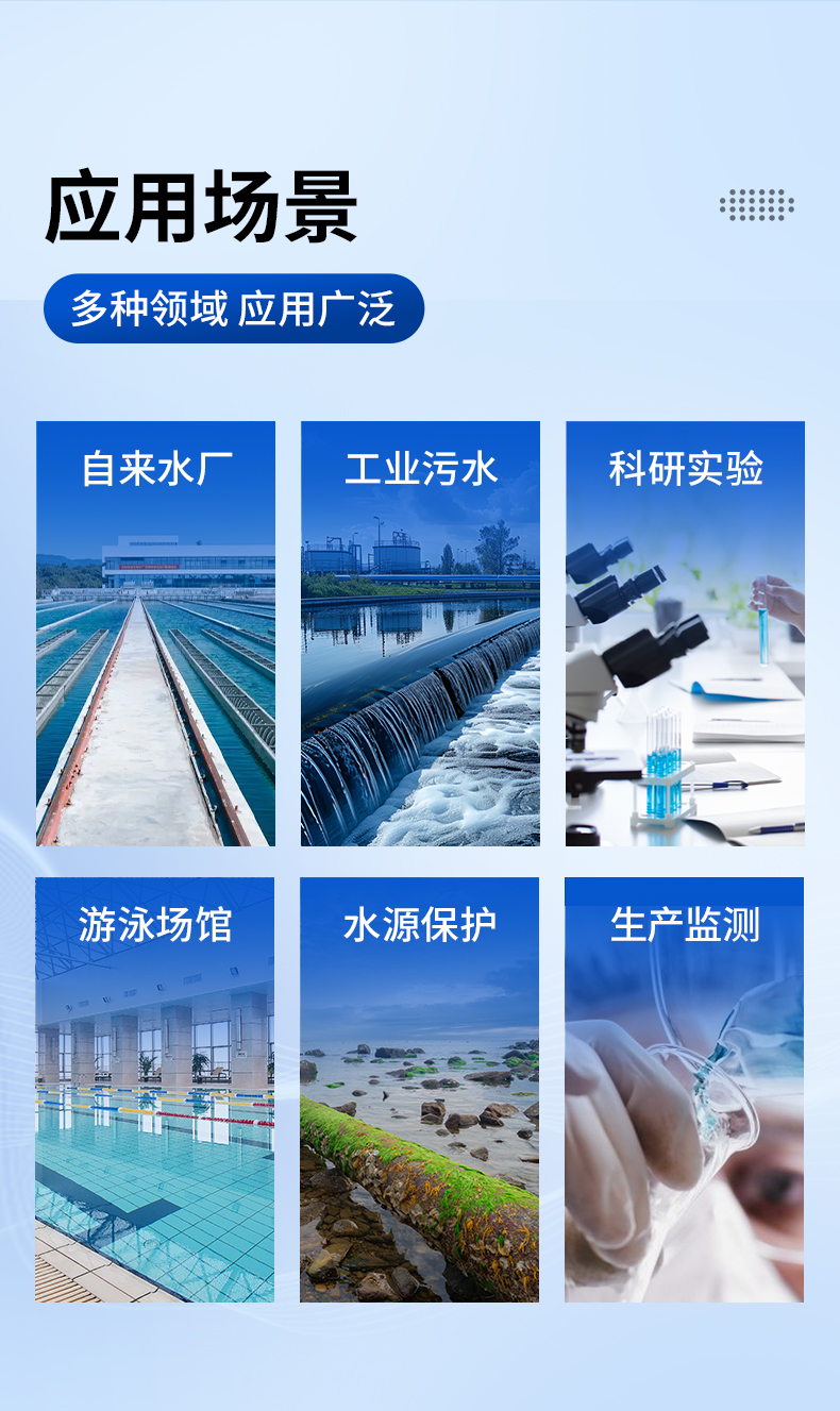 适用于纯净水厂、自来水厂、生活污水处理厂、工业污水、水产养殖、河流监测、游泳场馆、水源保护、生产监测、科研实验等。