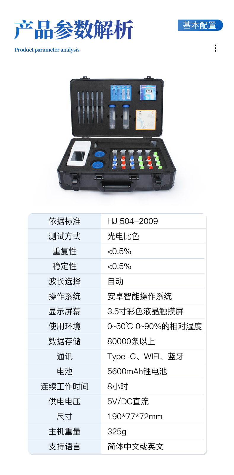 | 1、臭氧:0.02~1mg/L,0.2~10mg/L; | 2、依据标准:HJ 504-2009 | 3、测量方式:光电比色 | 4、重复性:<0.5%<> | 5、稳定性:<0.5%<> | 6、波长选择:自动 | 7、操作系统:安卓智能操作系统 | 8、显示屏幕:3.5寸彩色液晶触摸屏 | 9、灵敏度(吸光度):0.001 | 10、使用环境:温度0~50℃,湿度0~90% | 11、数据存储:80000条以上 | 12、通讯:Type-C、WIFI、热点、蓝牙 | 13、电池:5600mAh锂电池 | 14、连续工作时间:8小时 | 15、供电电压:5V/DC直流 | 16、外形尺寸:190*77*72mm | 17、主机重量:325g | 支持语言:简体中文或英文 | 19、仪器包装尺寸:350*150*300mm | 20、包装重量:1.9kg |