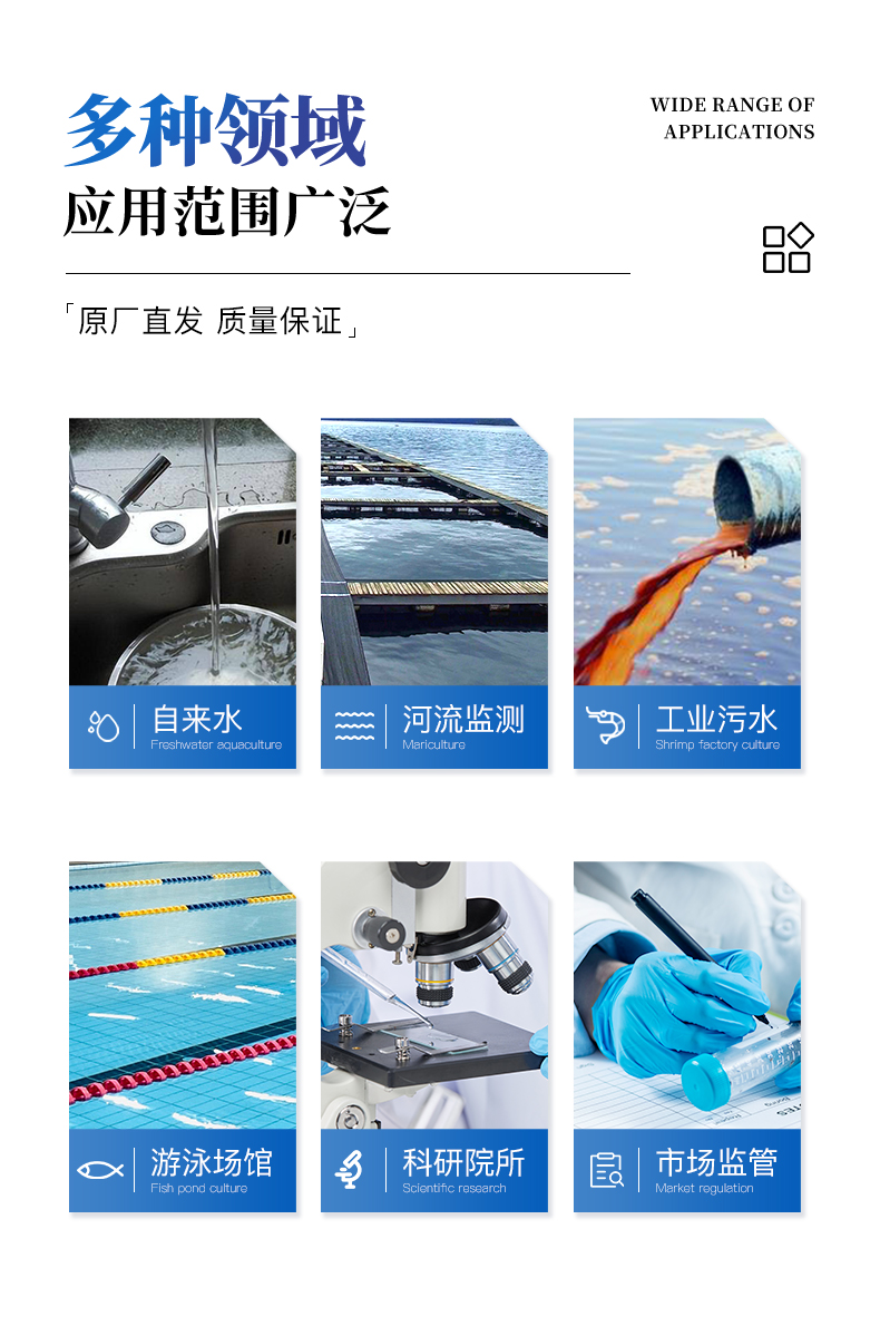 适用于 游泳场馆、饮用水、自来水、医疗废水、工业污、河流监测、水源保护、生产监测、科研实验等。
