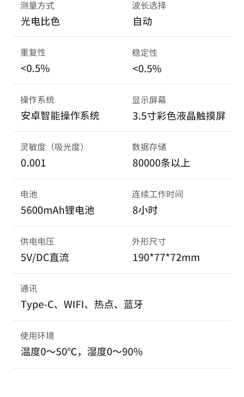 | 操作系统:安卓智能操作系统; | 显示屏幕:3.5寸彩色液晶触摸屏; | 灵敏度(吸光度):0.001; | 使用环境:温度0~50℃,湿度0~90%; | 数据存储:80000条以上; |