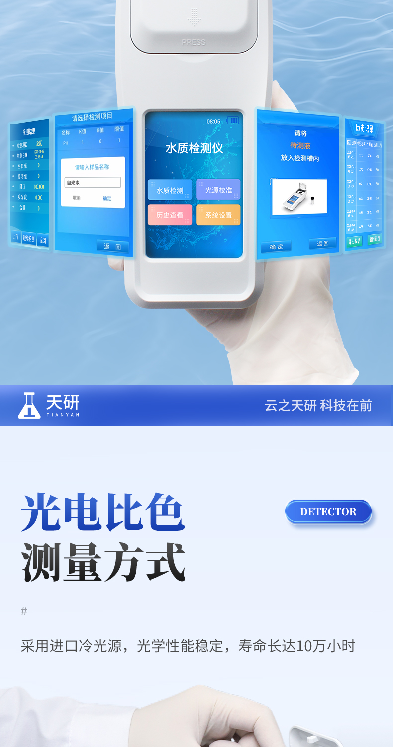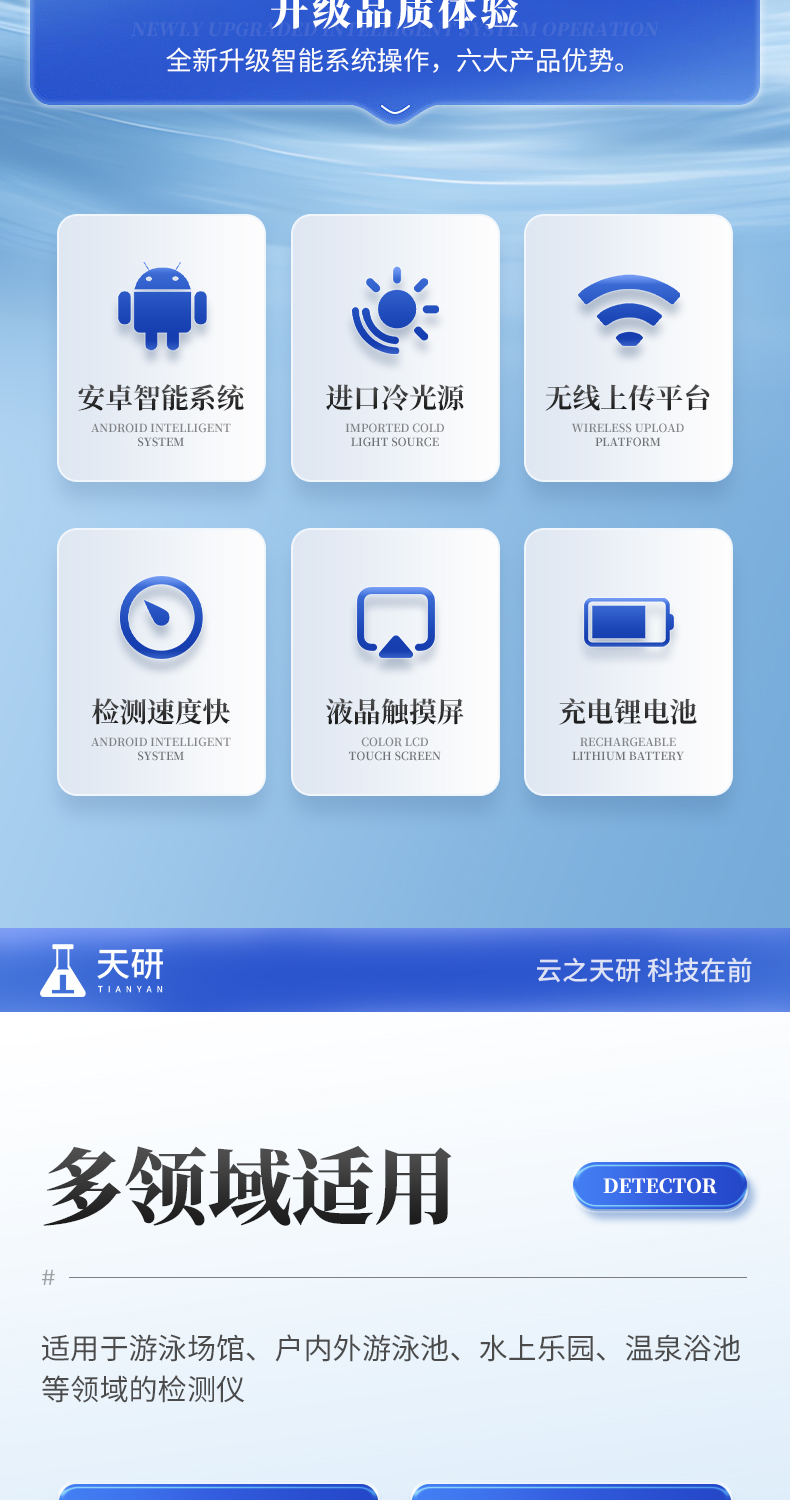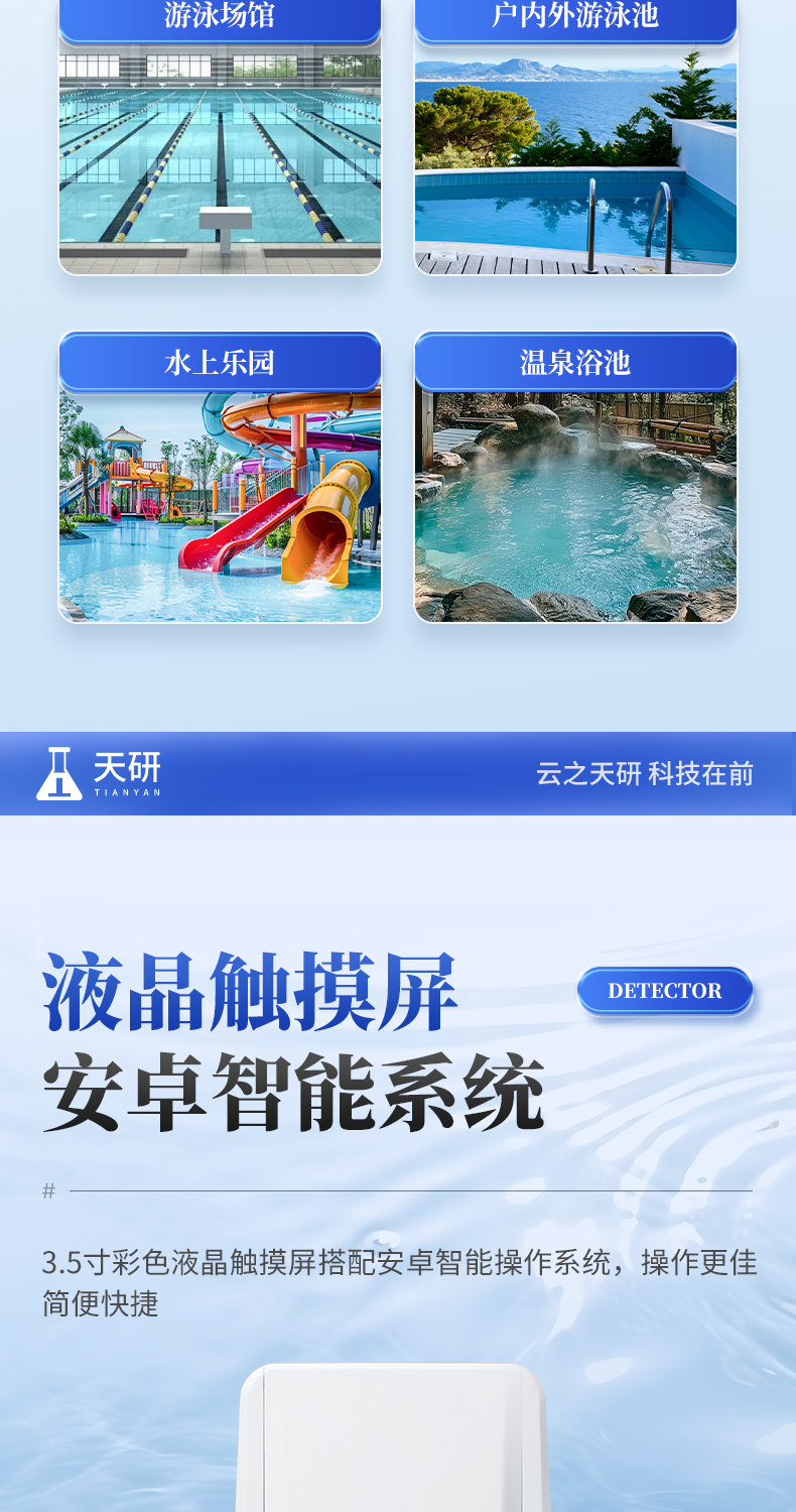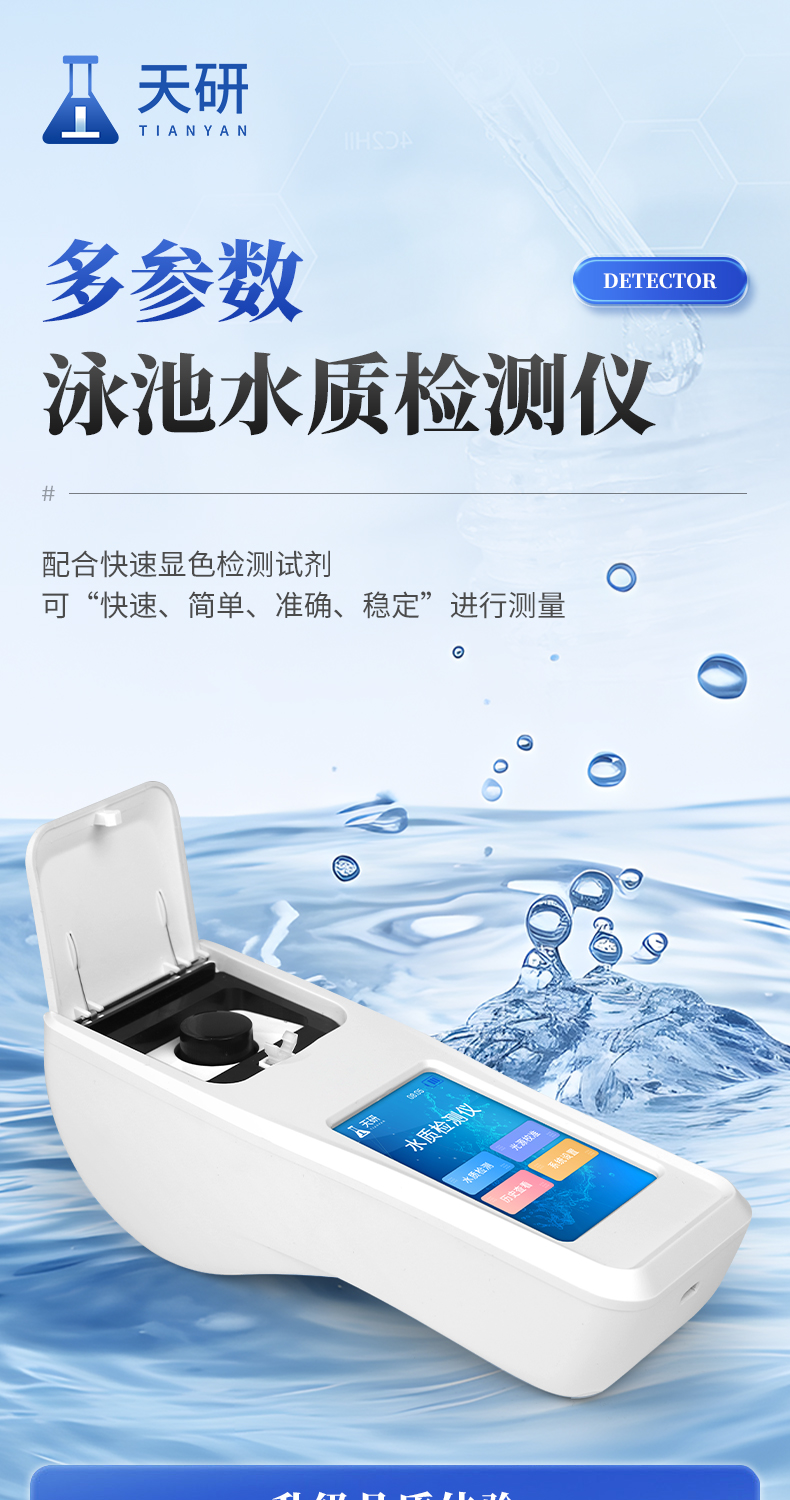 泳池水质检测仪是一款适用于游泳场馆、户内外游泳池、水上乐园、温泉浴池等领域的检测仪,配合快速显色检测试剂,可“快速、简单、准确、稳定”进行测量,拥有精美的外观造型,简单的操作界面,准确的检测系统,帮助用户获得精细的数据,可更准确、有效的分析水体状况。