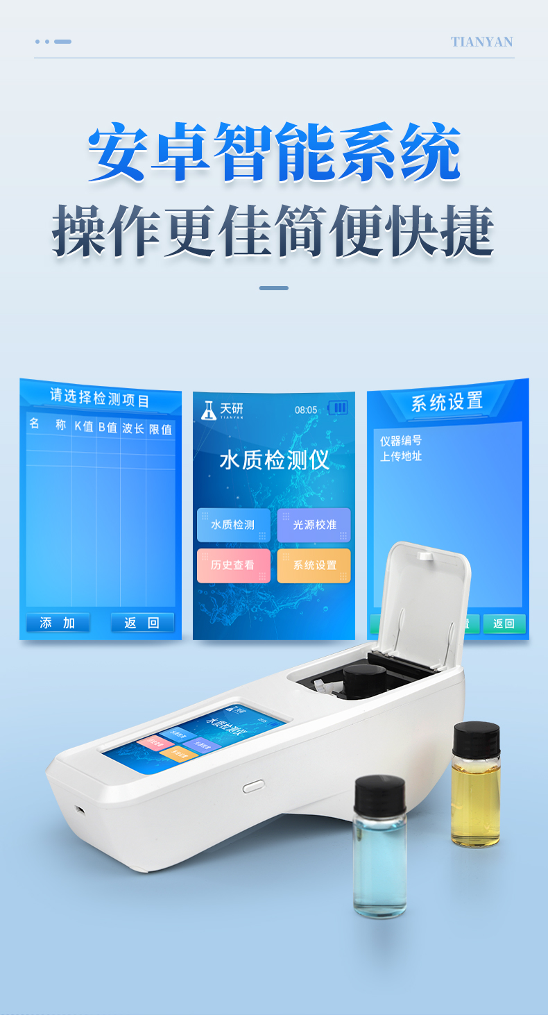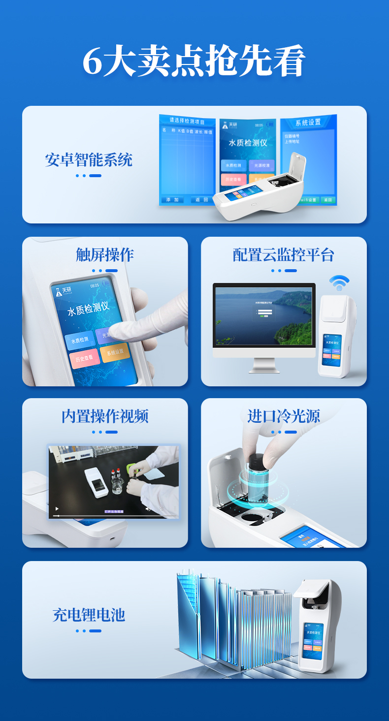 | 1、安卓智能系统,操作更佳简便快捷; | 2、配置云监控平台,检测结果可直接无线传至平台,进行水质长短期分析,辅助管理; | 3、内置操作流程、操作简单、无需培训、直接上手; | 4、检测速度更快,现场读取数据; | 5、便携式体积小,重量轻,方便户外检测; | 6、外形小巧美观,工作稳定免维护,具有较好的性价比; | 7、采用进口冷光源,光学性能稳定,寿命长达10万小时; | 8、交直流两用,内置充电锂电池,环保耐用可支持连续室内外工作。 |