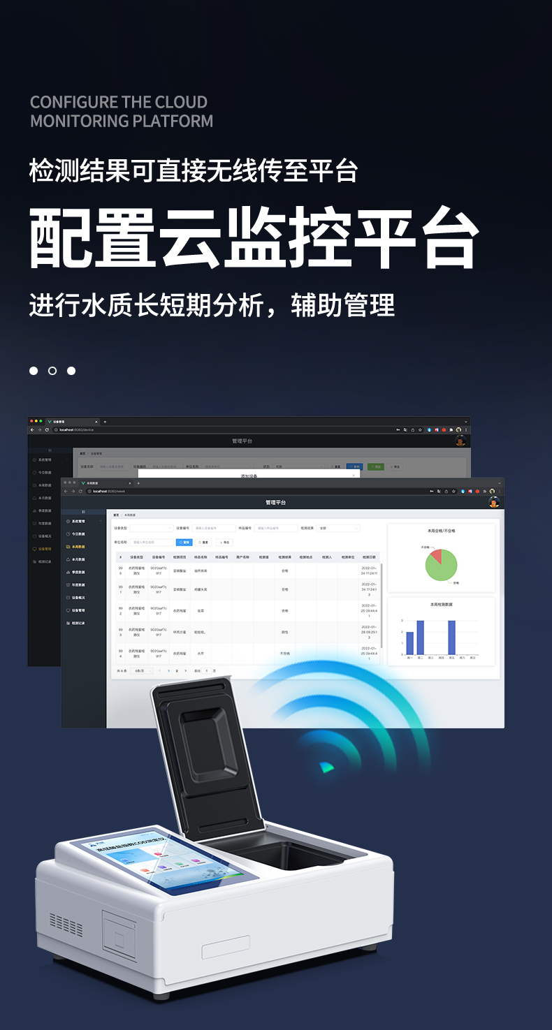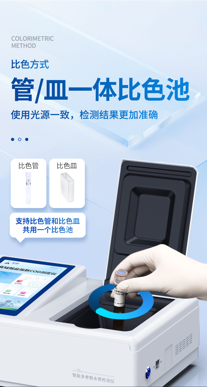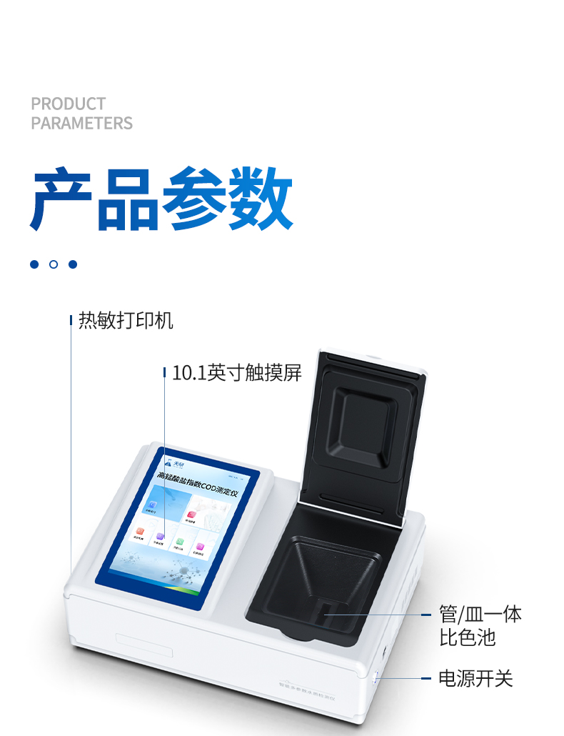| 1、采用全新安卓7.1.1智能操作系统,人性化中文操作界面,运转速度更快速,稳定性更强。 | 2、10.1英寸液晶触摸屏显示,人性化中文操作界面,读数直观、简单。 | 3、采用精密比色池设计,使用光源一致,可以解决由于光源误差带来的检测结果误差问题,检测结果更加精准。 | 4、光源采用进口超高亮发光二极管,光源亮度可以自动调节与校准。 | 5、支持10mm、30mm、50mm皿比色和φ16mm管比色等比色方式,多元选择,确保测量的准确性; | 6、具有无线通讯功能,支持WIFI、RJ45、手机热点联网传输,检测数据亦可通过U盘导出; | 7、多功能样品管理,可对样品进行中英文命名,方便样品记录和数据存储; | 8、仪器可永久存储800万组数据,为方便大量数据查找,可通过时间检索,并随意选择分析; | 9、仪器带有监管云平台,数据可通过局域网和互联网上传,亦可对接上传至环境监管部门平台。 | 10、内置热敏行式打印机,打印纸上的内容可自由选择(包括二维码打印); | 12、内置教学演示视频,用户可一边看仪器内操作视频,一边进行实验操作,更易上手。 | 13、后期产品固件可升级。 |