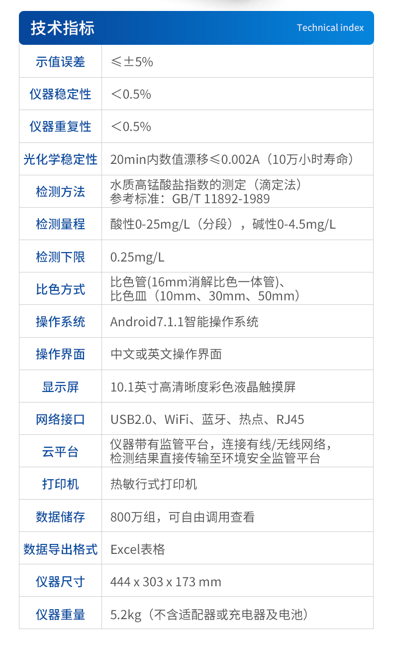 | 比色方式:比色管(16mm消解比色一体管)、比色皿(10mm、30mm、50mm); | 操作系统:Android7.1.1智能操作系统; | 操作界面:中文或英文操作界面; | 显示屏:10.1英寸高清晰度彩色液晶触摸屏; | 网络接口:USB2.0、WiFi、蓝牙、热点、RJ45; | 云平台:仪器带有监管平台,连接有线/无线网络,检测结果直接传输至环境安全监管平台; | 打印机:热敏行式打印机; | 数据储存:800万组,可自由调用查看; | 数据导出格式:Excel表格; | 仪器尺寸:444 x 303 x 173 mm; | 仪器重量:5.2kg(不含适配器或充电器及电池); |