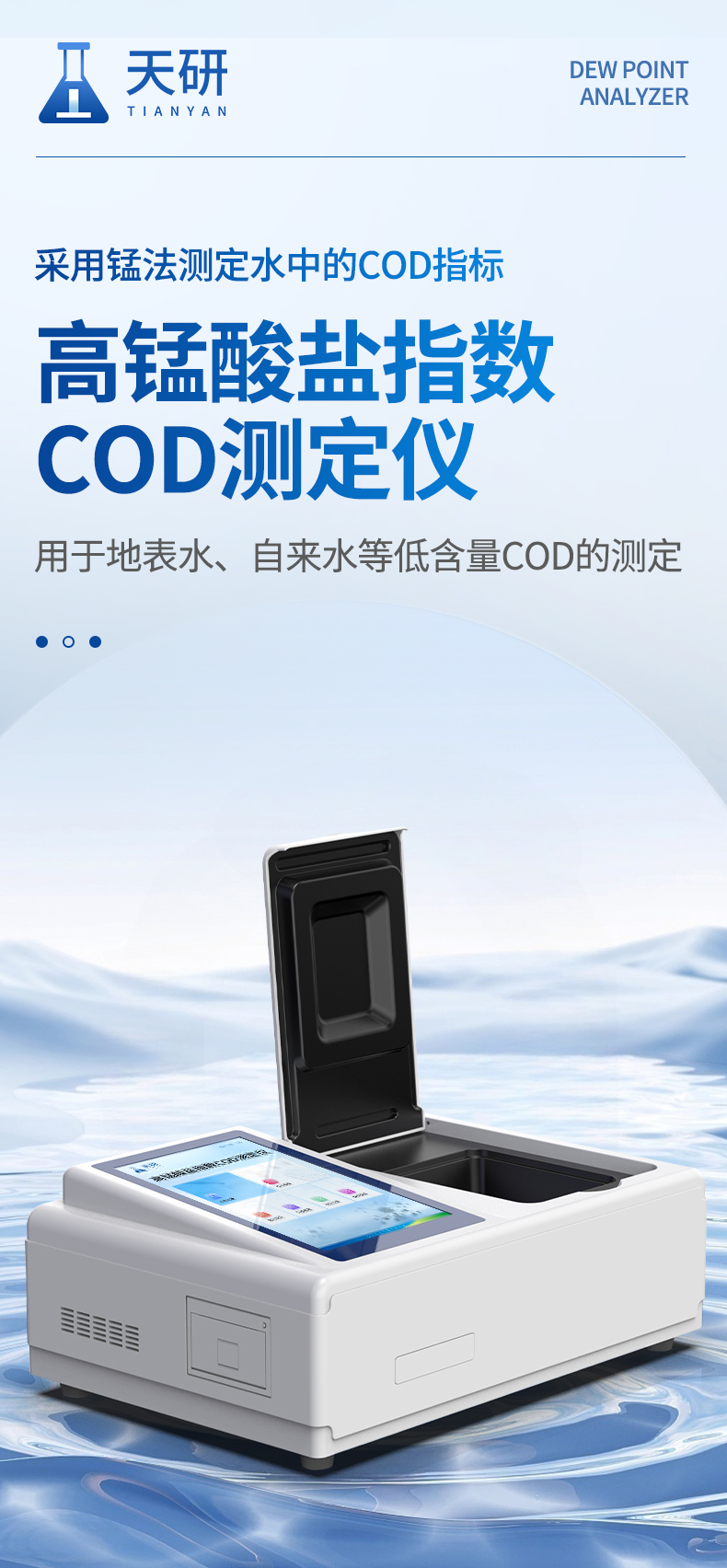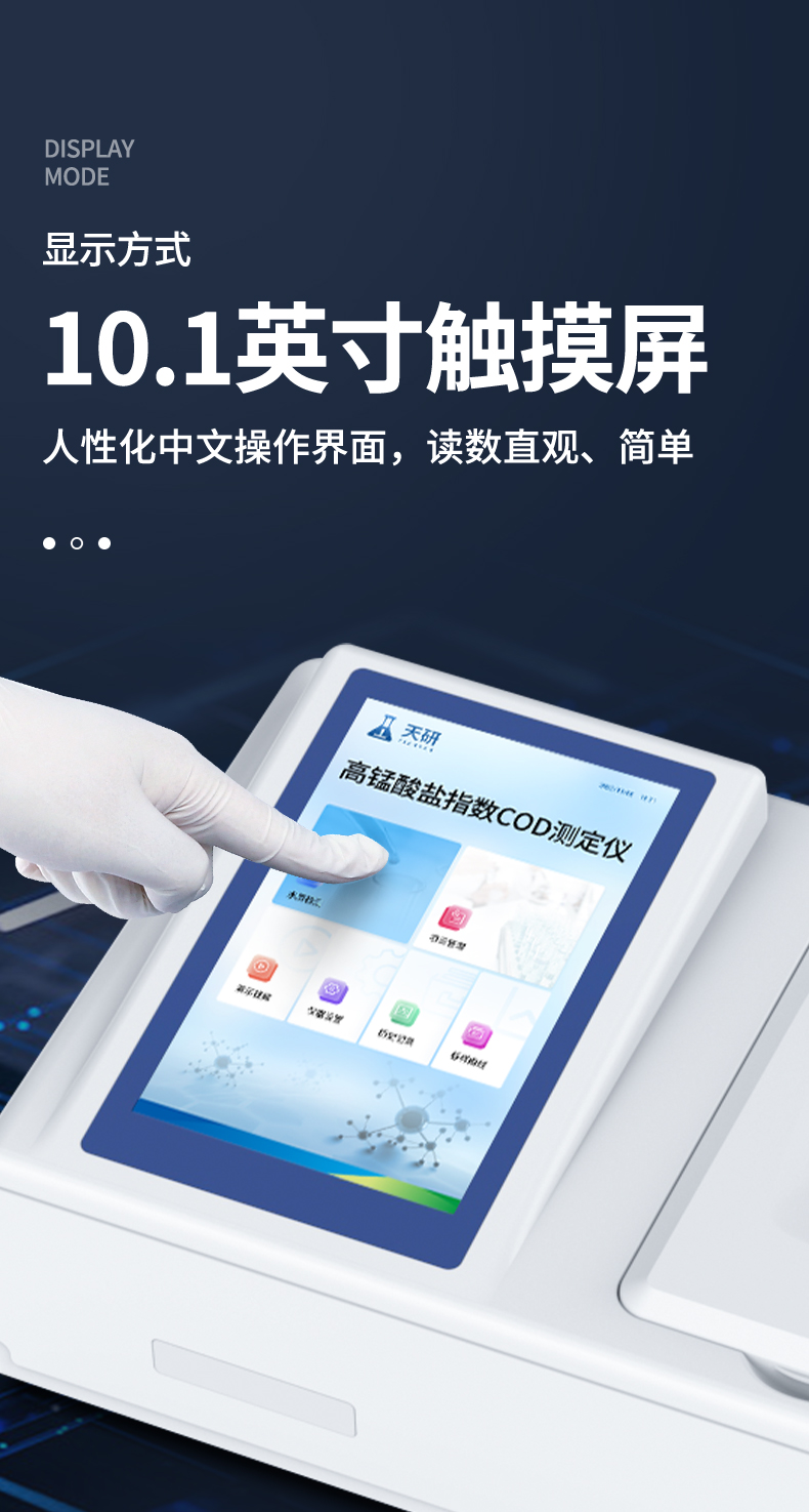 高锰酸盐指数检测仪(CODMn)是参考标准《GB/T 11892-1989 水质高锰酸盐指数的测定》设计制造,适用于国内外众多检测标准。 本仪器采用锰法测定水中的COD指标,又称CODMn或高锰酸盐指数,兼具智能数据分析功能,图表、列表显示数据,分析一目了然;高清晰度彩色液晶触摸显示屏,Android智能操