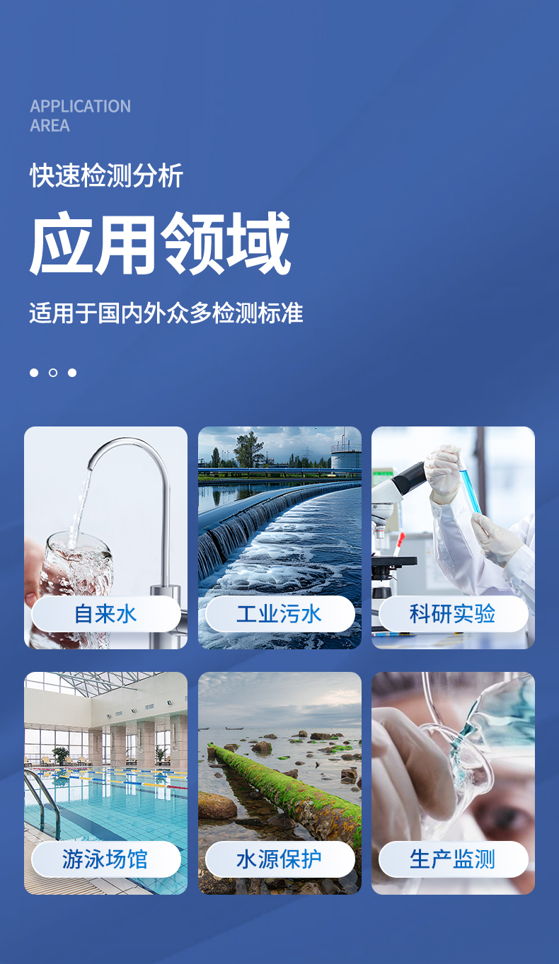 高锰酸盐指数检测仪(CODMn)是参考标准《GB/T 11892-1989 水质高锰酸盐指数的测定》设计制造,适用于国内外众多检测标准。 本仪器采用锰法测定水中的COD指标,又称CODMn或高锰酸盐指数,兼具智能数据分析功能,图表、列表显示数据,分析一目了然;高清晰度彩色液晶触摸显示屏,Android智能操作系统,中文显示界面,中英文键盘,人性化操作,使用更简单。 广泛适用于地表水、自来水等低含量COD的测定。