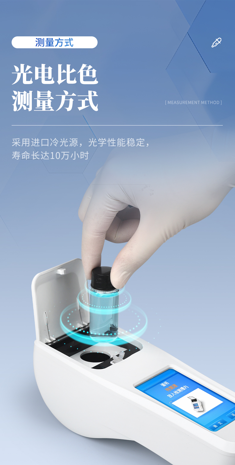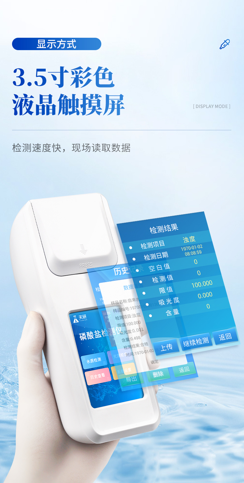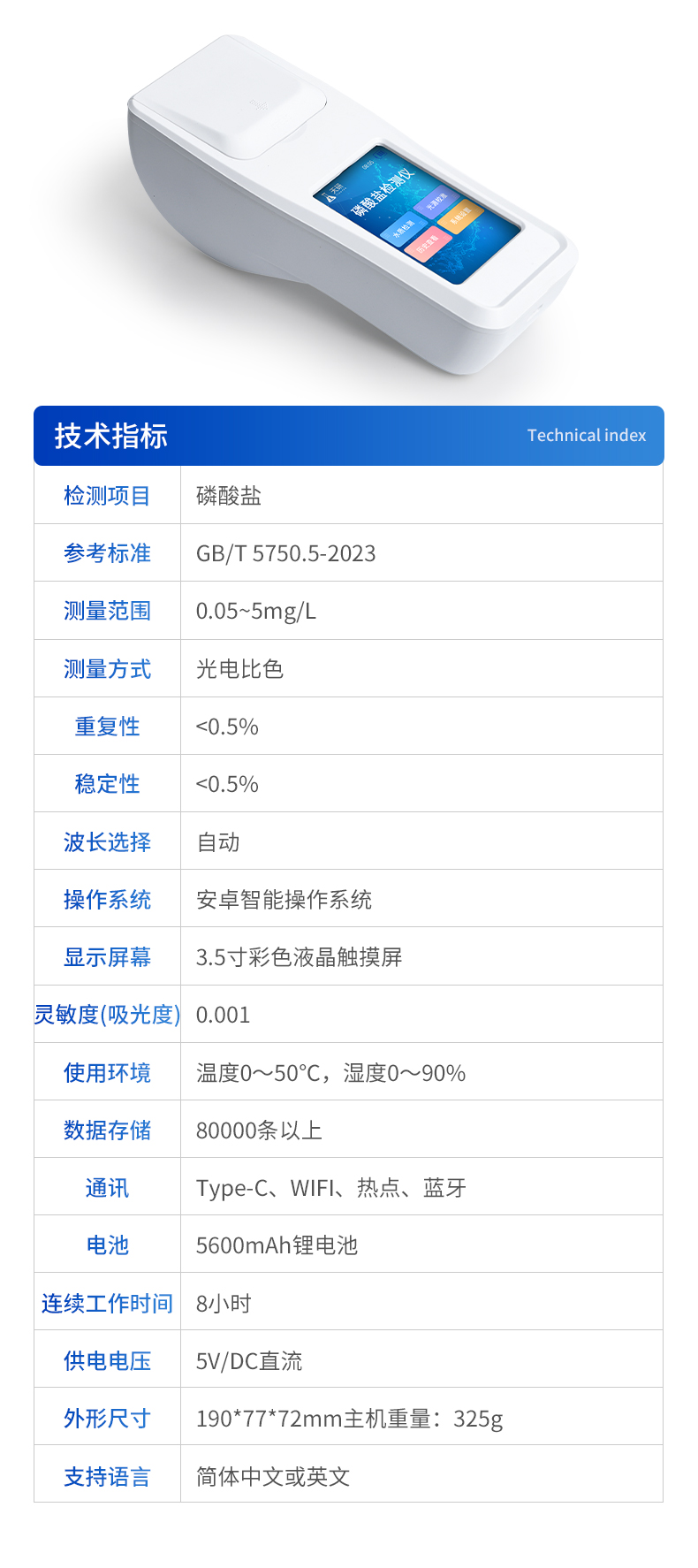 | 检测项目:磷酸盐 | 参考标准:GB/T 5750.5-2023 | 测量范围:0.05~5mg/L | 测量方式:光电比色 | 重复性:<0.5%> | 稳定性:<0.5%> | 操作系统:安卓智能操作系统 | 显示屏幕:3.5寸彩色液晶触摸屏 | 灵敏度(吸光度):0.001 | 使用环境:温度0~50℃,湿度0~90% | 数据存储:80000条以上 | 通讯:Type-C、WIFI、热点、蓝牙 | 电池:5600mAh锂电池 | 连续工作时间:8小时 | 供电电压:5V/DC直流 | 外形尺寸:190*77*72mm主机重量:325g | 支持语言:简体中文或英文 |