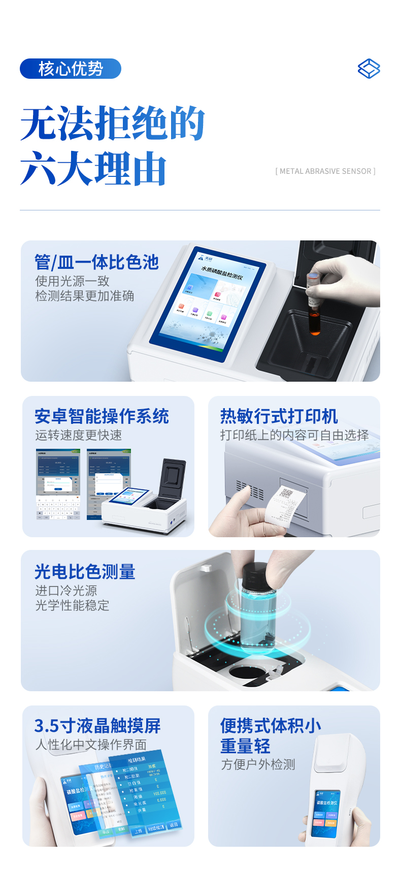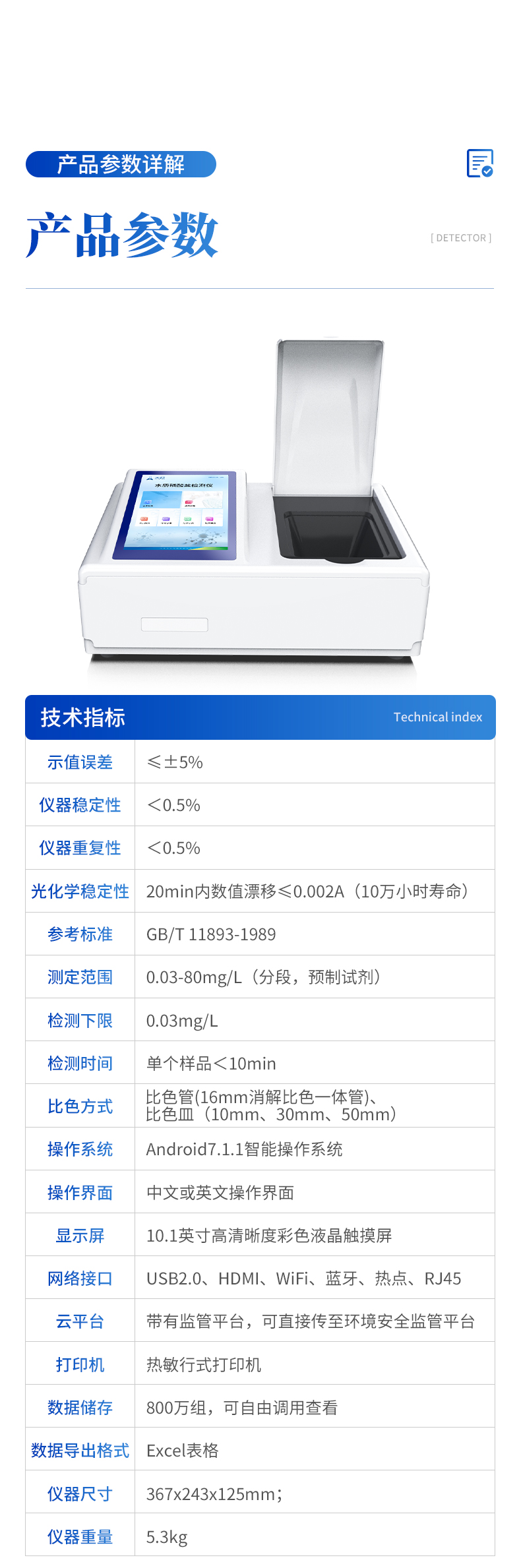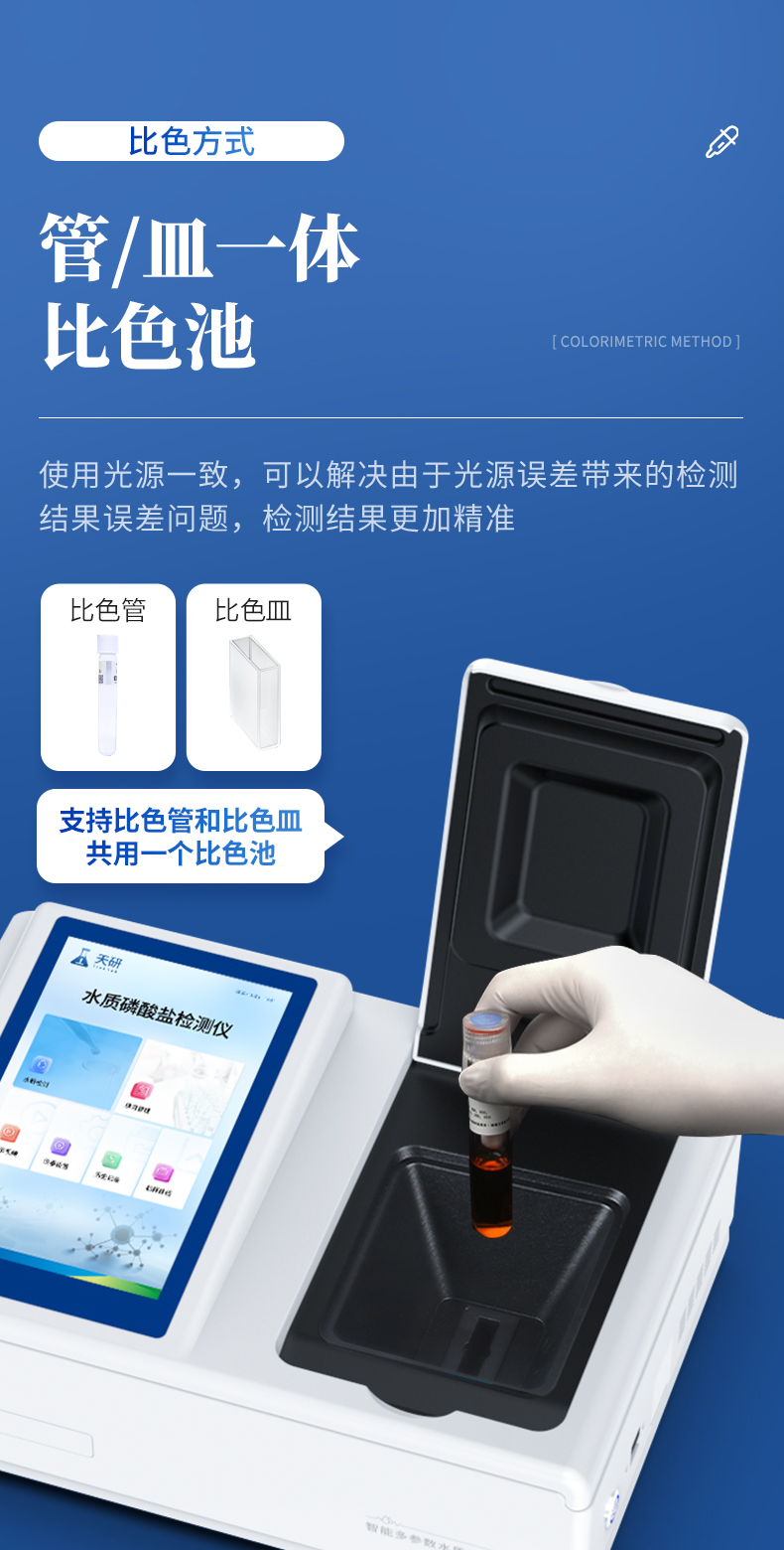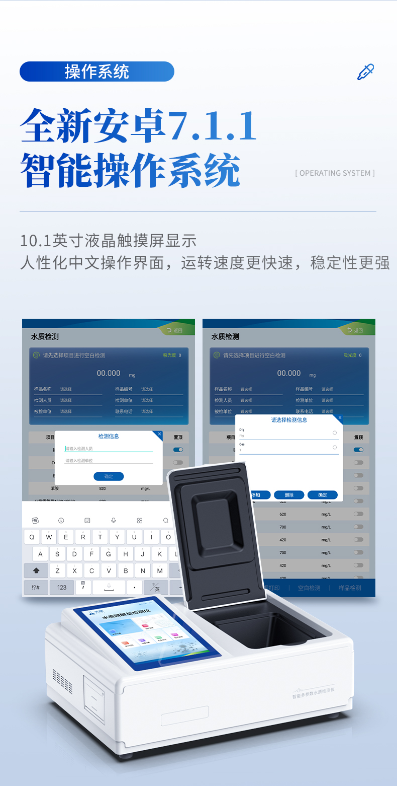 | 检测项目:磷酸盐 | 参考标准:GB/T 5750.5-2023 | 测量范围:0.05~5mg/L | 测量方式:光电比色 | 重复性:<0.5%> | 稳定性:<0.5%> | 操作系统:安卓智能操作系统 | 显示屏幕:3.5寸彩色液晶触摸屏 | 灵敏度(吸光度):0.001 | 使用环境:温度0~50℃,湿度0~90% | 数据存储:80000条以上 | 通讯:Type-C、WIFI、热点、蓝牙 | 电池:5600mAh锂电池 | 连续工作时间:8小时 | 供电电压:5V/DC直流 | 外形尺寸:190*77*72mm主机重量:325g | 支持语言:简体中文或英文 |
