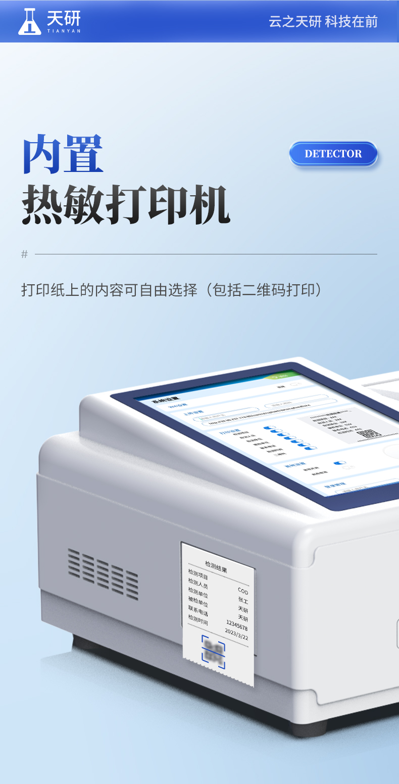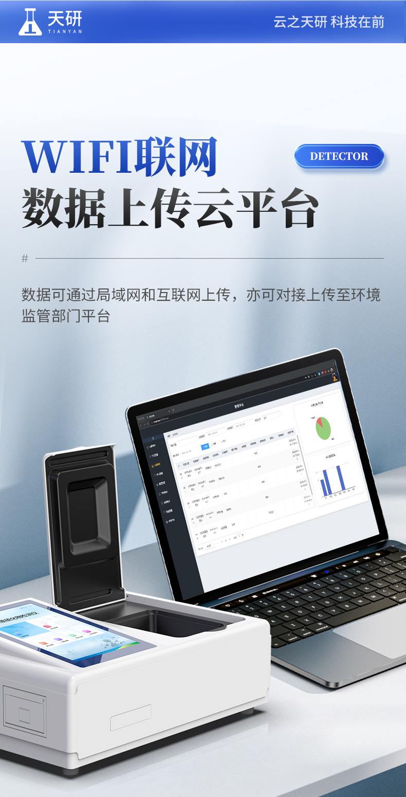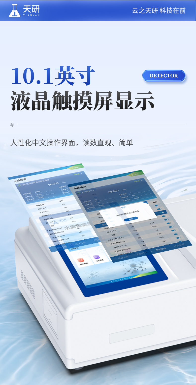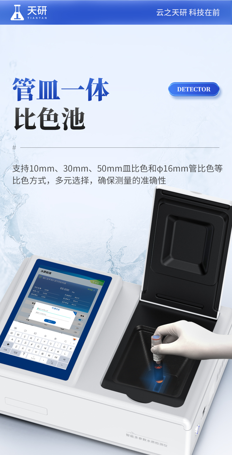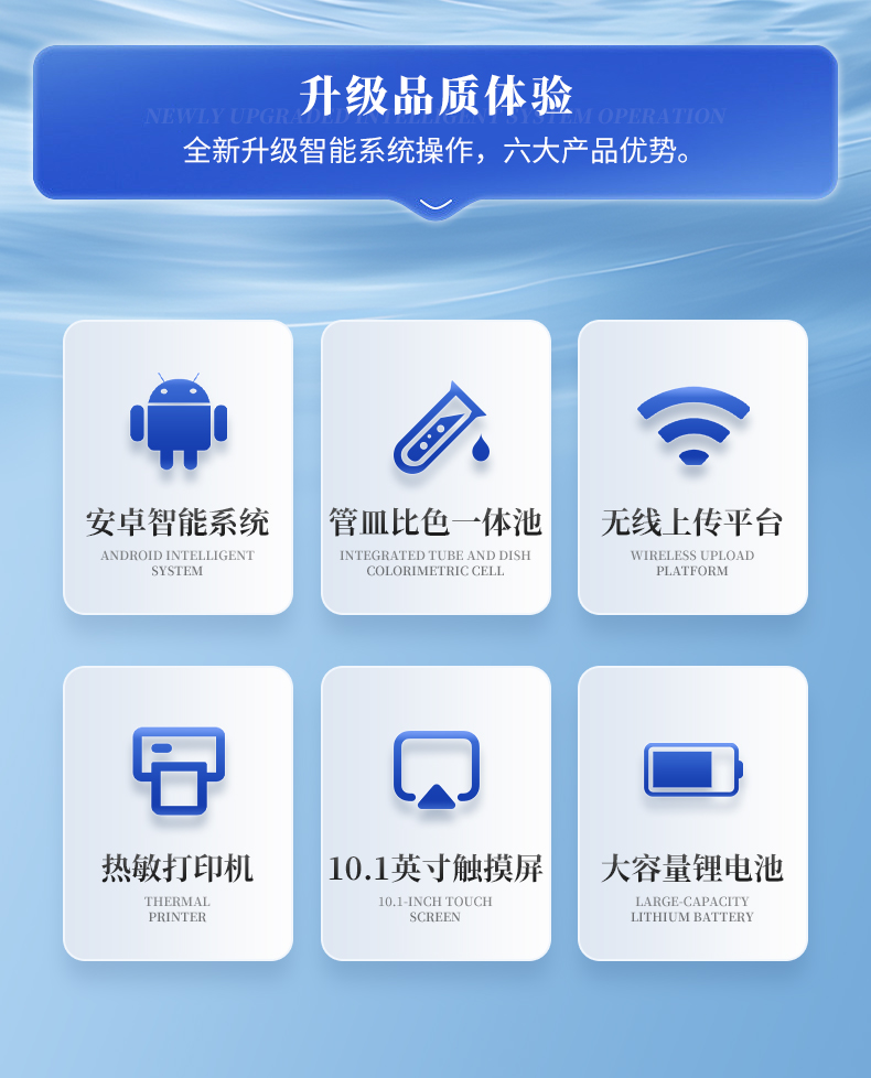 | 1、采用全新安卓7.1.1智能操作系统,人性化中文操作界面,运转速度更快速,稳定性更强。 | 2、10.1英寸液晶触摸屏显示,人性化中文操作界面,读数直观、简单。 | 3、采用精密比色池设计,使用光源一致,可以解决由于光源误差带来的检测结果误差问题,检测结果更加精准。 | 4、光源采用进口超高亮发光二极管,光源亮度可以自动调节与校准。 | 5、支持10mm、30mm、50mm皿比色和φ16mm管比色等比色方式,多元选择,确保测量的准确性; | 6、具有无线通讯功能,支持WIFI、RJ45、手机热点联网传输,检测数据亦可通过U盘导出; | 7、多功能样品管理,可对样品进行中英文命名,方便样品记录和数据存储; | 8、仪器可永久存储800万组数据,为方便大量数据查找,可通过时间检索,并随意选择分析; | 9、支持HDMI输出,方便用户培训、讲解、及大屏展示。 | 10、仪器带有监管云平台,数据可通过局域网和互联网上传,亦可对接上传至环境监管部门平台。 | 11、内置热敏行式打印机,打印纸上的内容可自由选择(包括二维码打印); | 12、交流220V,可选配6ah大容量充电锂电池,方便户外流动测试; | 13、内置教学演示视频,用户可一边看仪器内操作视频,一边进行实验操作,更易上手。 | 14、后期产品固件可升级。 |