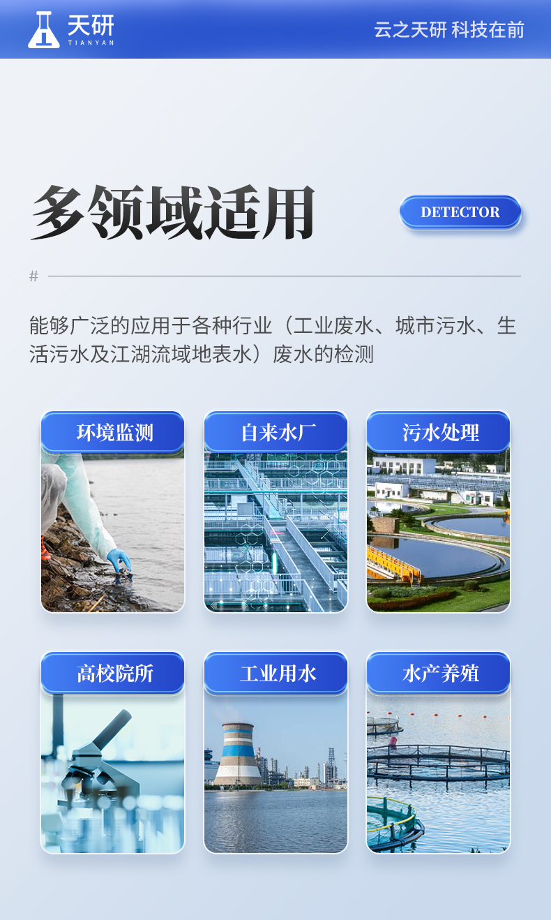 能够广泛的应用于各种行业(工业废水、城市污水、生活污水及江湖流域地表水)废水的检测,可适合不同用户的多种需求,可在化工、石油、焦化、造纸、冶金、酿造、医药等工业废水及各种生活污水监测应用。