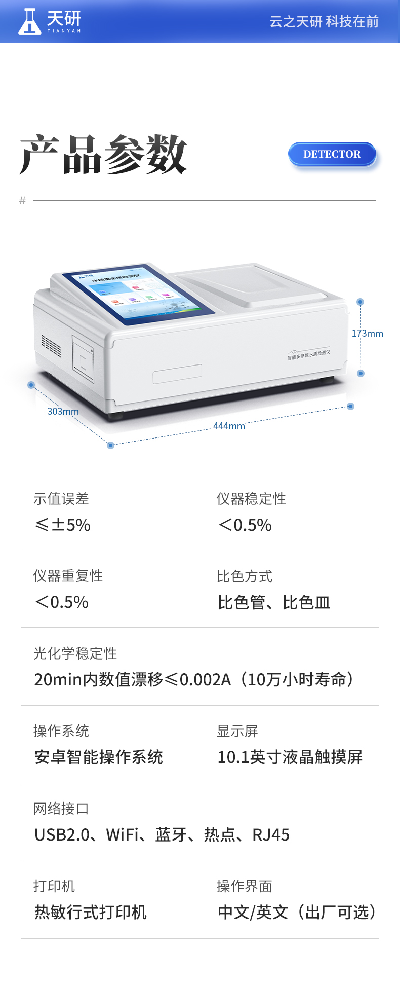 | 1、操作系统:Android 7.1.1 智能操作系统; | 2、显示屏:10.1英寸高清晰度彩色液晶触摸屏; | 3、网络接口:USB2.0、WiFi、蓝牙、热点、RJ45; | 4、操作界面:中文/英文(出厂可选); | 5、比色方式:比色管、比色皿; | 6、打印机:热敏行式打印机; | 7、通讯接口:USB2.0; | 8、供电方式:交流220V,可选配大容量充电锂电池; | 9、数据导出格式:Excel表格; | 10、云平台:仪器带有监管平台,连接网络,检测结果直接传至环境安全监管平台; | 11、仪器尺寸:444 x 303 x 173 mm; | 12、仪器重量:5.2kg(不含适配器或充电器及电池); |