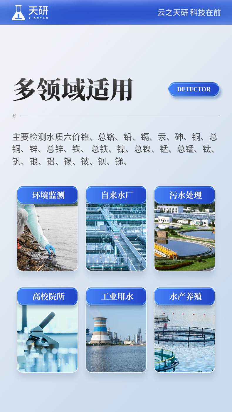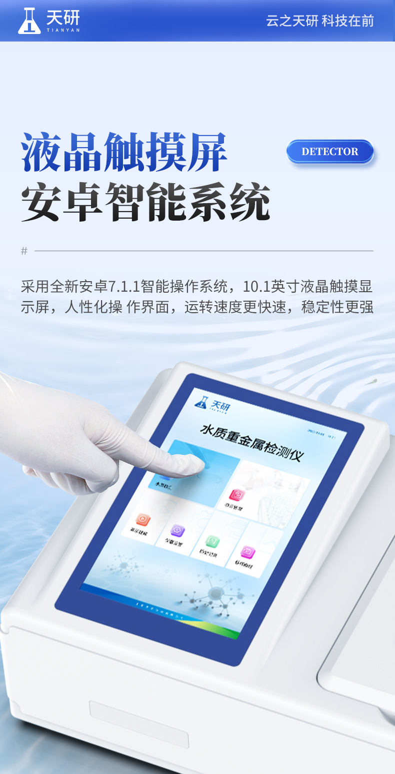 多参数水质重金属检测仪是完全参考国家标准、环境标准等相关标准设计制造,适用于国内外众多检测标准。 主要检测水质六价铬、总铬、铅、镉、汞、砷、铜、总铜、锌、总锌、铁、总铁、镍、总镍、锰、总锰、钛、钒、银、铝、锡、铍、钡、锑、钴等重金属含量指标;本仪器兼具智能数据分析功能,图表、列表显示数据,分析一目了然;高清晰度彩色液晶触摸显示屏,Android智能操作系统,中文显示界面,中英文键盘,人性化操作,使用更简单。