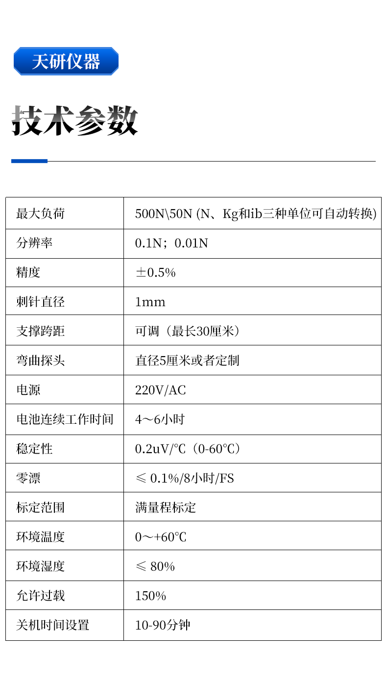 | 最大负荷:500N(N (N、Kg和lb三种单位可自动转换) | 分辨率:0.1N;0.01N |