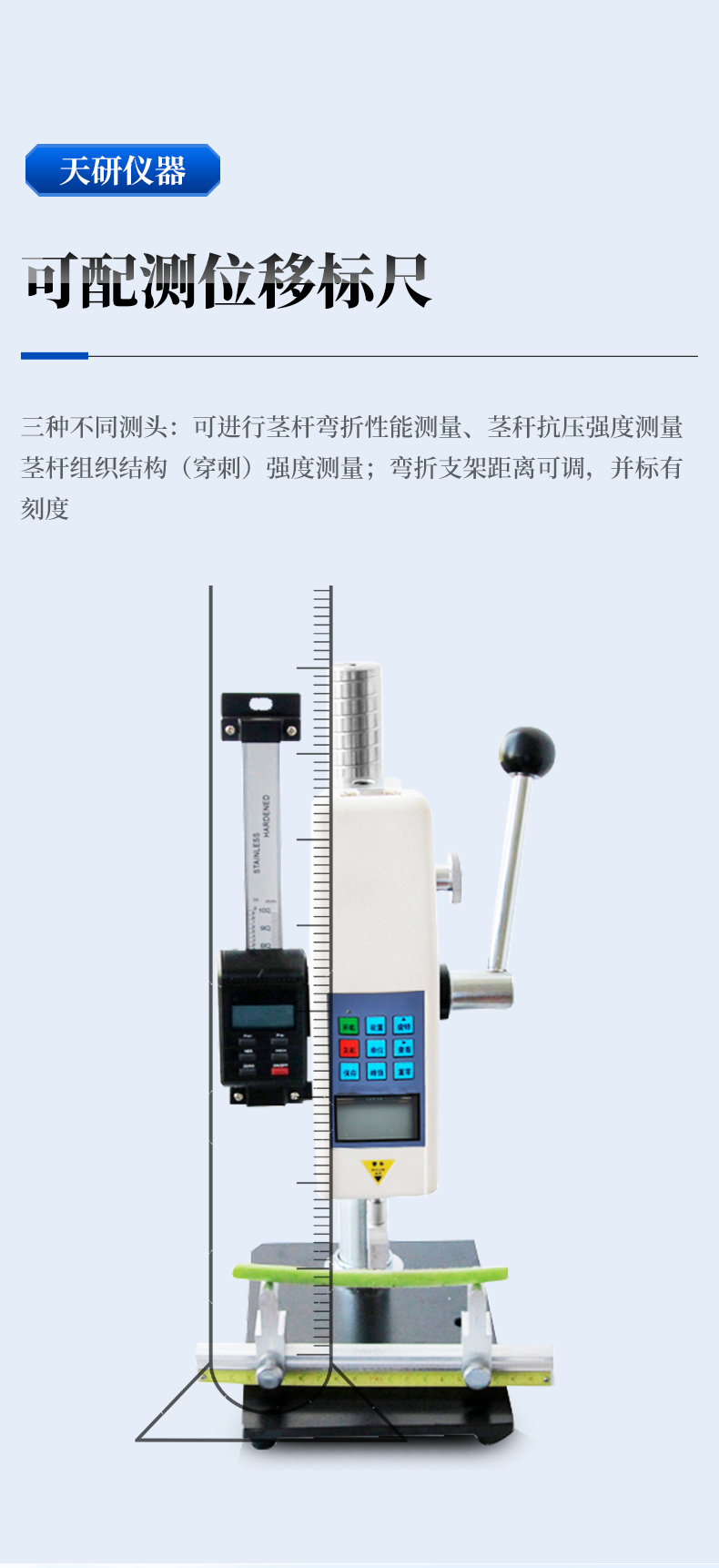 配置3种测试探头,可进行茎秆弯折性能测量、抗压强度测量及组织结构(穿刺)强度测量。