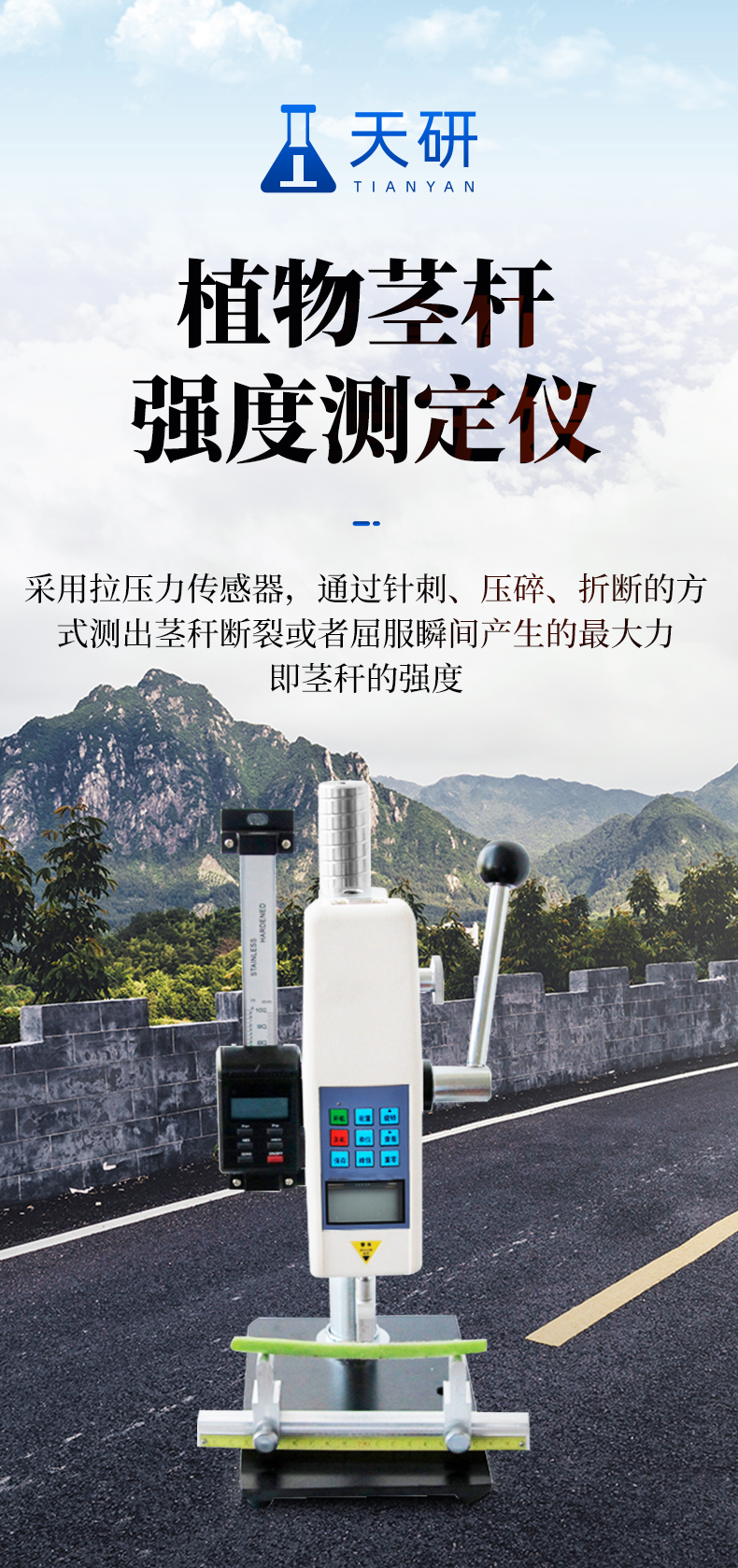 植物茎秆的强度是决定作物抗倒伏能力的一个主要因素。长期以来,玉米、高粱、烟草等作物的倒伏给机械收割造成很大困难,从机械化水平来说,造成了大量的粮食浪费。另外,作物倒伏导致光照不充分,使其生产量受到极大限制。在作物生长的各个阶段对其茎秆进行活体测量,进而根据茎秆纤维层的抗弯阻力与抗倒伏能力的相关性对群体测量数据进行统计处理,对作物的栽培和育种具有重要意义。植物茎秆强度仪采用拉压力传感器,通过针刺、压碎、折断的方式测出茎秆断裂或屈服瞬间产生的最大力,即茎秆的强度。