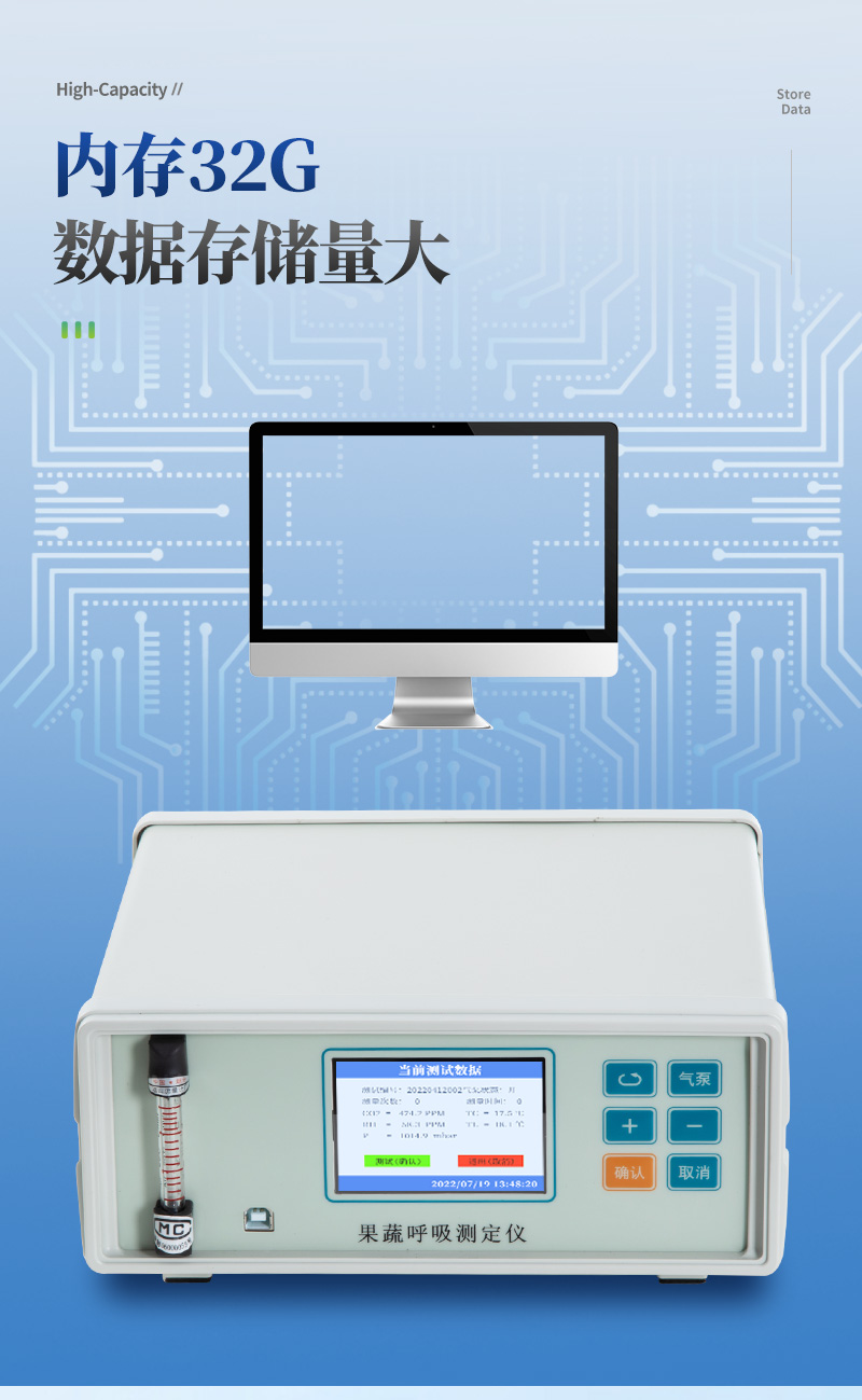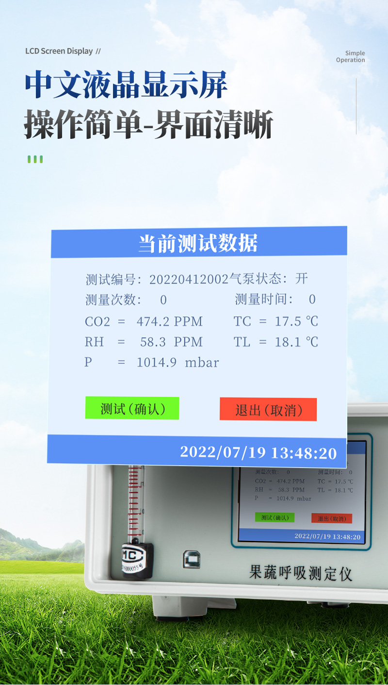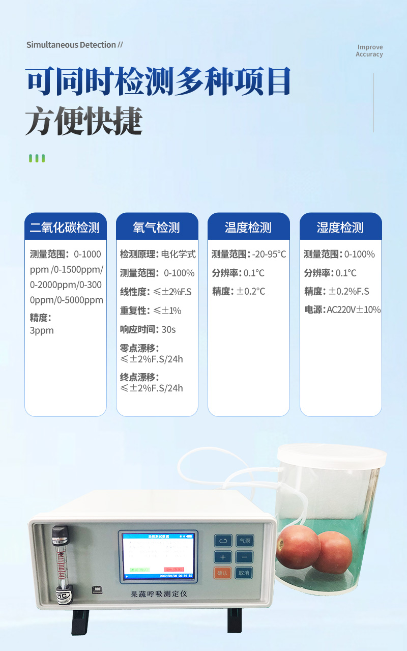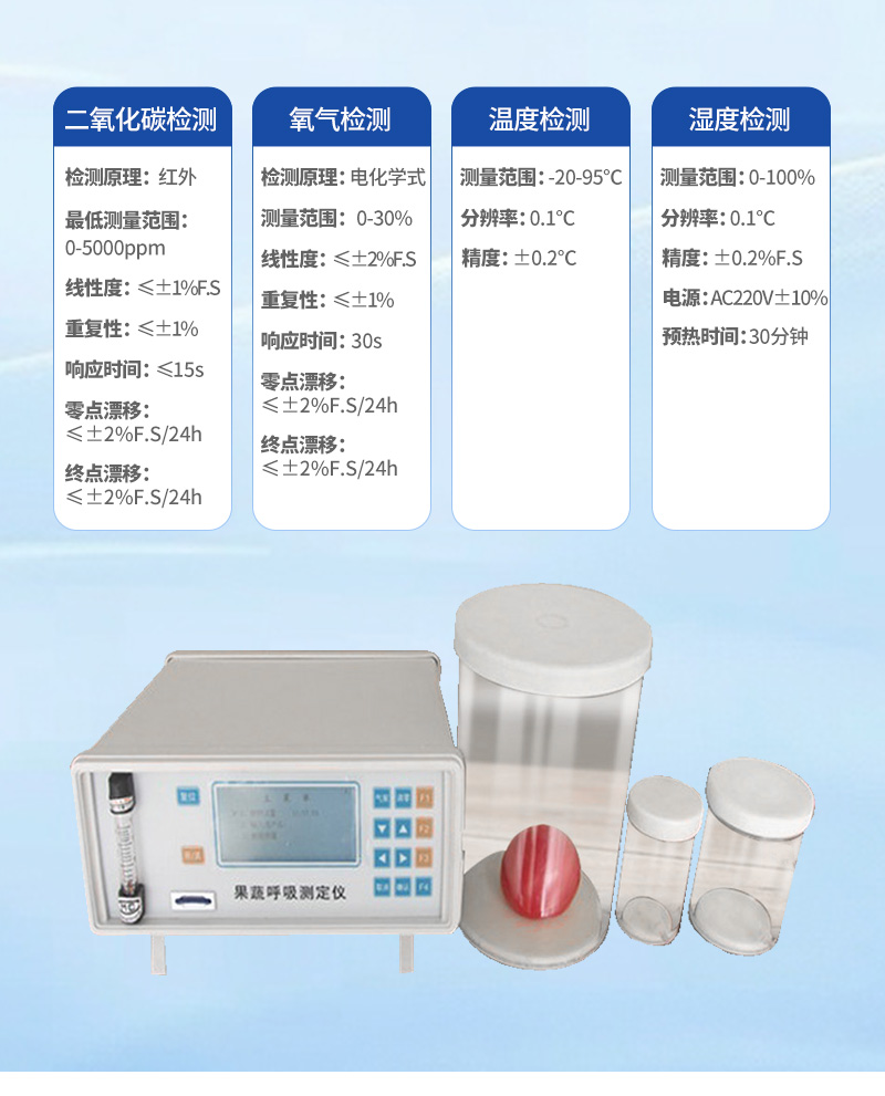 果蔬呼吸测定仪专门用于常温、冷藏库、气调库、超市冷柜等储藏条件下的果品和蔬菜呼吸强度的测定和分析研究。该仪器的特点是可以根据果蔬的大小来选择不同体积的呼吸室,加快了平衡和测定时间;可以同时显示呼吸室的CO2浓度、O2浓度、温度和湿度。该仪器具有多功能、高精度、快速、**、方便等特