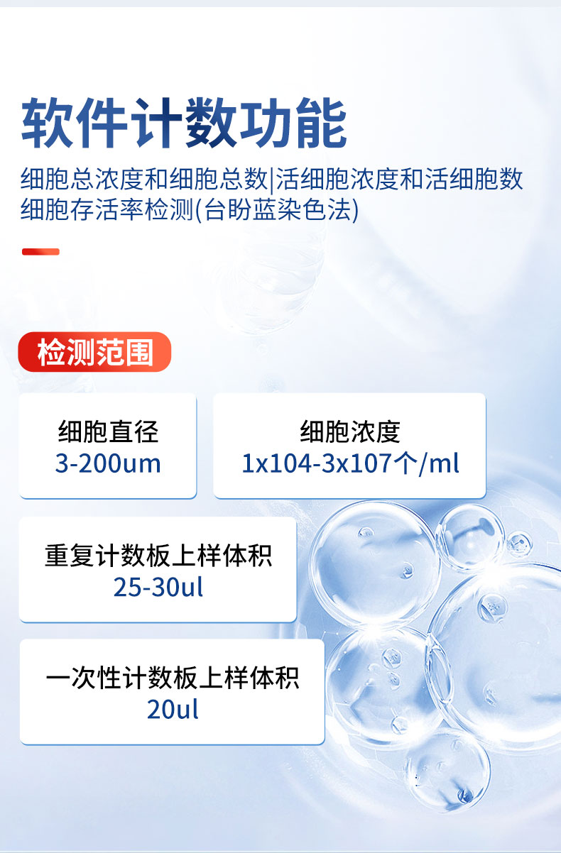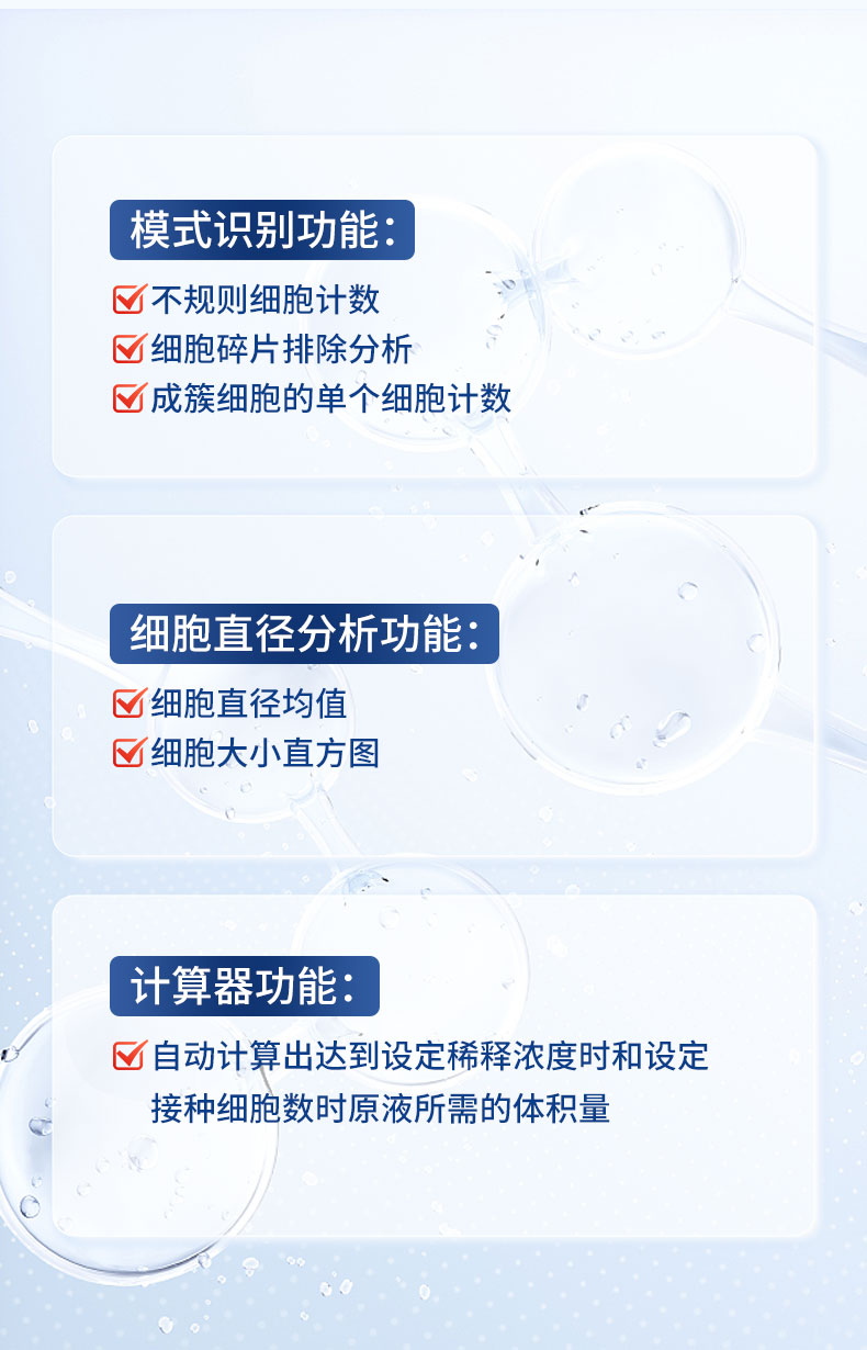 计数功能: 1、细胞总浓度和细胞总数; 2、活细胞浓度和活细胞数; 3、细胞存活率检测(台盼蓝染色法); 模式识别功能: 1、细胞碎片排除分析; 2、成簇细胞的单个细胞计数; 3、不规则细胞计数; |